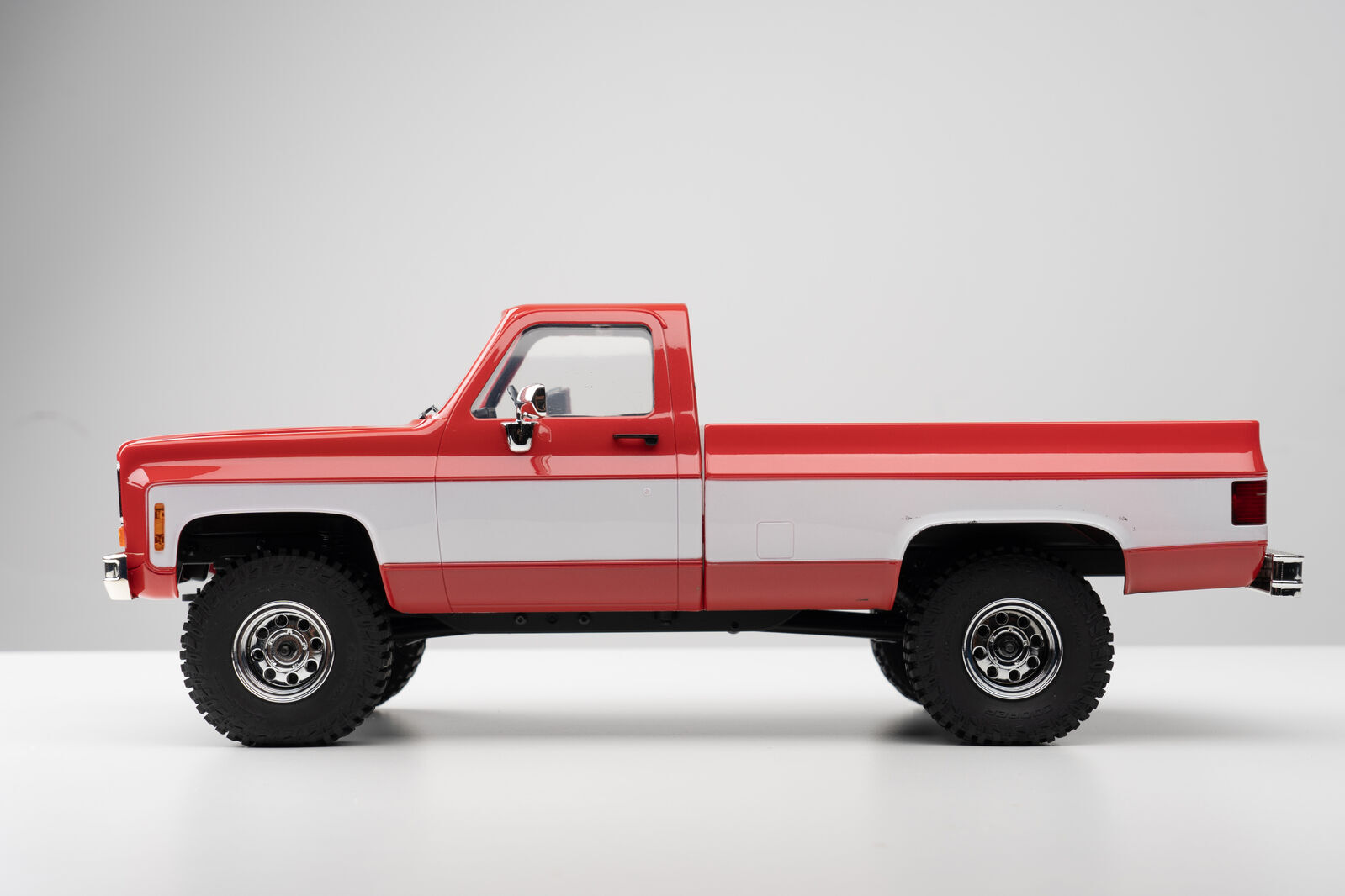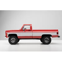 Most RC model trucks with hard plastic body shells are scale SUVs, making this 1/18 scale pickup something of a rarity. Its premium two-tone color scheme duplicates the look of the original 1974 Chevrolet K10.