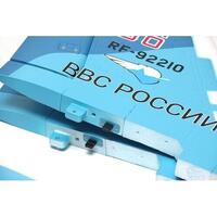 Static means degree of reduction. FMS captures the essence of this fighter. Functional restoration, such as large size airbrake, LED navigation lights AND; landing lights, full-motion tail, landing gear door with sequencing effect, retractable landing gear system that can resist hard landings, static restoration such as cockpit details, panel lines, detachable ordnance, pilot, and highly recognizable trim scheme, all these details combine to make the FMS Su-27 stand out on the tarmac and in flight.