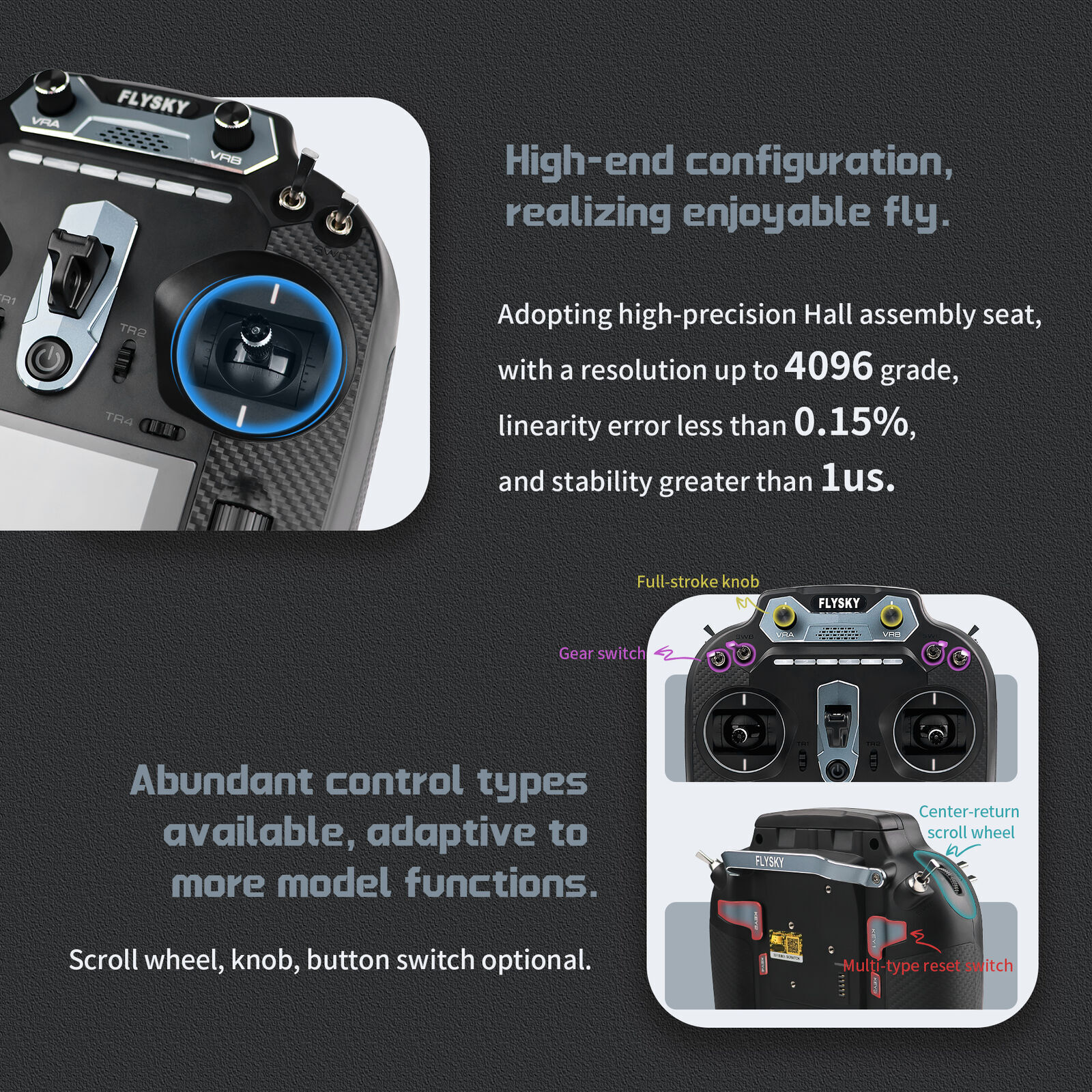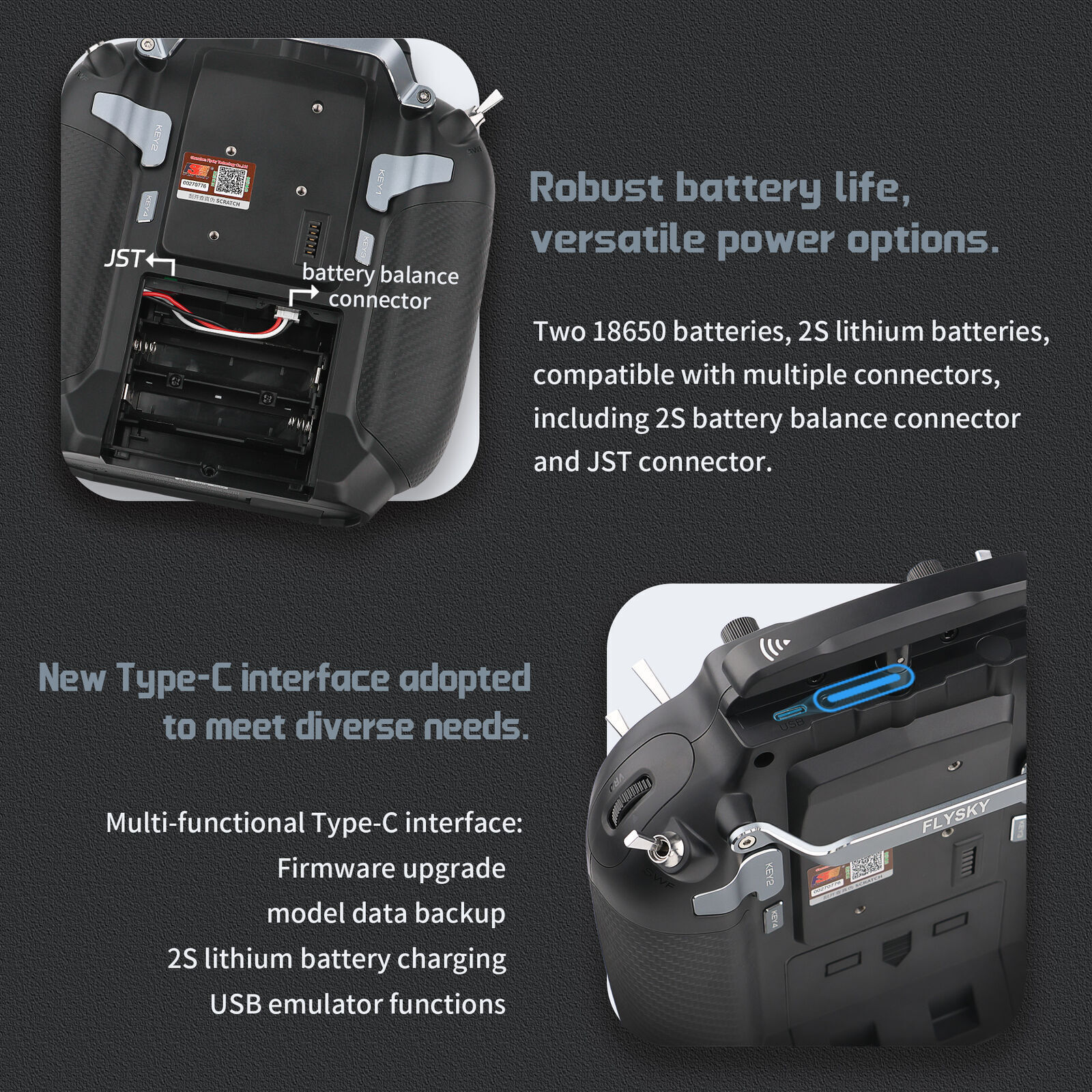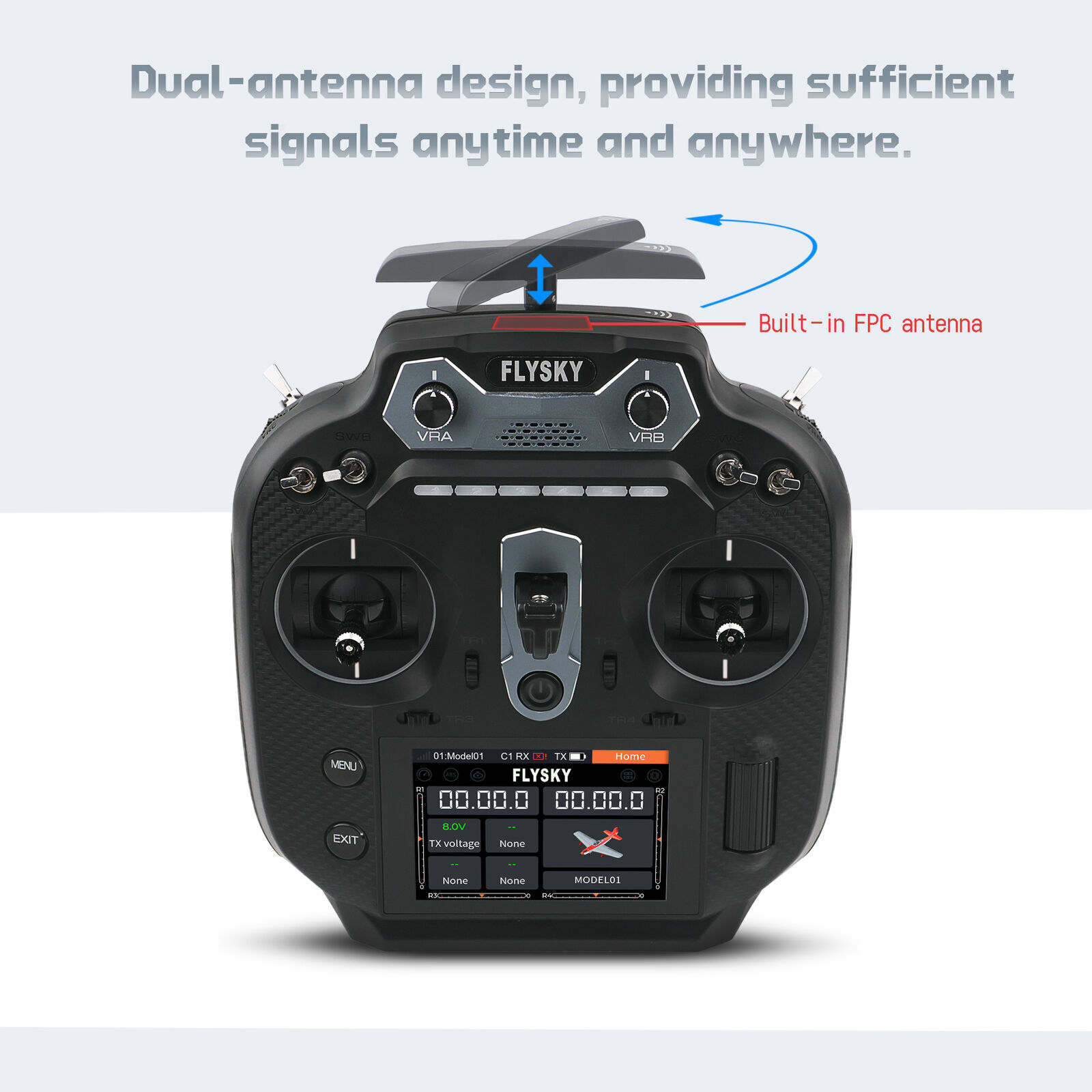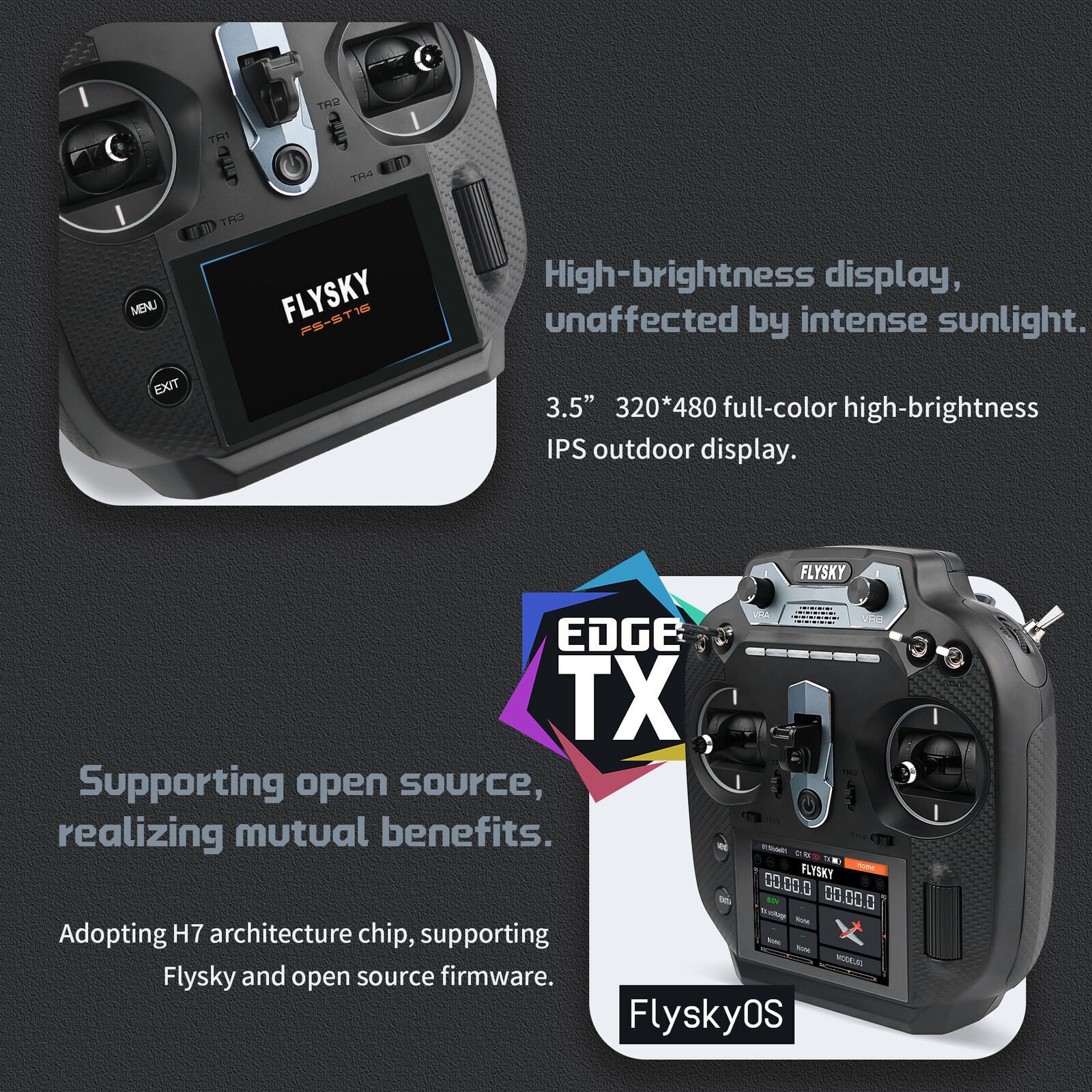 Product Model: FS-ST16 Compatible Receiver FS-SR8 and other receivers with ANT protocol Compatible RC Model: Airplanes, cars or boats Number of Channels: 16 RF: 2.4GHz ISM Maximum Power < 20dBm (e.i.r.p.) ?EU? RF Protocol: ANT Resolution: 4096 Data Connector: USB Type-C, 3.5mm Audio Jack(DSC), SD card slot Input Power 6-9V/DC; 18650*2PCS/2S LiPo Distance: No less than 1500m (Air distance without interference) Antenna: Two antennas(One bulit-in antenna and one external folding antenna) Display: 3.5 inch 320*480 full dot color non-touch IPS screen Online Update: Yes Temperature Range-10? ~ +60? Humidity Range 20% ~ 95? Color: Black Language: Chinese or English Weight: 665g Dimensions: 224.1*180*101.3mm Charging Jack: Yes ?Type-C Port? Certifications: CE, FCC ID: 2A2UNST160 (FS-ST16)
