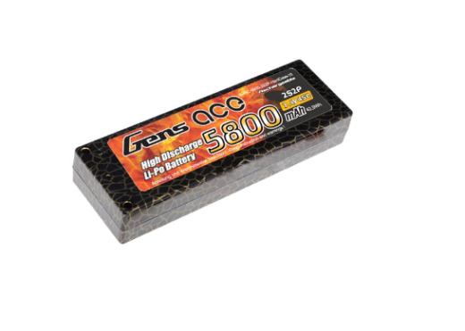 Gens ace hard case lipo 5800mah 2s2p 50C/100C battery Suited to the following models: 1/8 & 1/10 RC car model such as Traxxas Slash, Emaxx,Bandit, Rustler version, HPI Strada XB 1/10 RTR Electric Buggy,Kyosho GP 4WD RACING TRUCK etc. Team Associated SC8, etc. Fast charging by 5C is available. Roar approved.