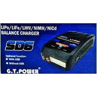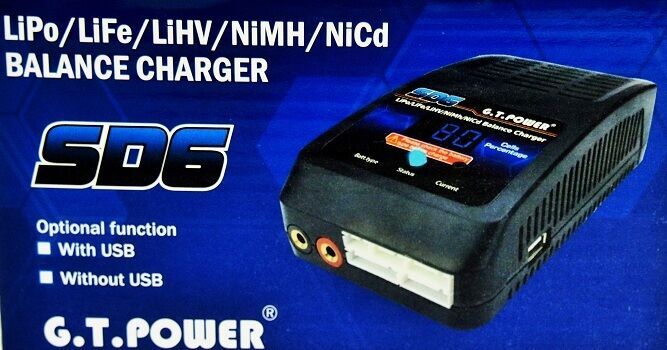 Description: GT-SD6 AC (240V) Multi chemistry charger Charge current: selectable 1A/2A/4A/6A Circut power: Max 50W Supports: 2-6s Li-po/Li-fe and 4-10 cell NiMh/NiCd Cable: Deans charge cable included Also has a USB port with output of 5V/1A (GT-SD6)