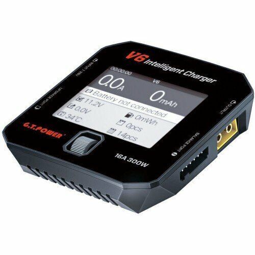 The g. T. Power v6 charger is a simple yet powerful multifunctional charger with built in lipo balancing (jst-xh) for up to 6s. It is packed with features that exceeds many higher cost units. Primarily designed for lithium polymer (lipo, li-poly) batteries, it can also charge li-ion, li-fe (a123m1), ni-cd, ni-mh, and pb (lead acid) batteries. Features smart ultra modern charger 2. 4"" ips tft high defination screen rolling push button control up to 16a charging current capacity limit maximum safety temperature monitoring input power monitoring easy to program buttons 10 battery memory individual cell monitoring built in balancer to 6s packs cycle charging/discharging includes ""fast"" & ""storage"" li-xx programs product details output 300w when voltage is greater then 21v dc discharge 25w balancing current 1a/cell operating input voltage : 7 - 28v dc ni-cad / ni-mh : 1 - 16 cells lipo / li-ion / li-fe : 1 - 6 series charge current : 0. 1 - 16. 0a discharging current: 0. 1 - 3. 0a pb / lead acid : 2 - 24v built in cell balancer : up to 6s (series) li-po (jst-xh connectors) no. Of cycles : up to 5 cycles weight : 120g dimensions : 80mm x 80mm x 32mm (gt-v6)