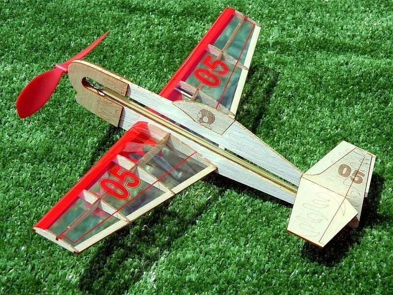 The kit contains LASER CUT balsa parts, plastic propeller & wheels, detailed stick on wing covering and rubber band motors. All you will need to complete the model is glue and wire cutters!