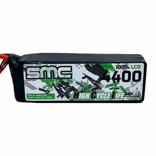 HCL-HP 14.8V-4400mAh-80C. Our HCL-HP flight packs are made with 100% LCO cathodes for maximum cycle life and performance. You will not find a pack with better performance for the same weight. Please note these are not LiHV cells these are normal cells that must be charged at 4.20V per cell. mAh +/- 5%: 4400mAh Voltage: 14.8V Factory C rate: 80C Size: 31mm x 45mm x 141mm G10 bottom & top plates. Weight: 432gr Wire size: 10AWG Charge rate: 1C to 5C please note that a higher charge rate will put less mAh into the pack and will reduce cycle life (SMC-4480-4S1P-XT90)