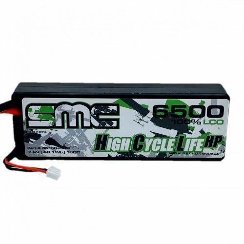 HCL-HP 7.4V-6500mAh-150C pack. Hardcase Introducing the new HCL-HP series designed to give your RC truck , car or boat high performance and reliability. Based off our popular DV Extreme series with an update in materials to increase the mAh to size ratio. Built with 100% LCO cathodes for optimum performance and cycle life. The low IR(internal resistance) of the cells used in these packs means you wil get very good acceleration and speed while keeping the pack down in temperature. True mAh +/- 5%: 6500mAh Voltage: 7.4V C rate: 150C Size: 26mm x 47mm x 139mm Hardcase Weight: 353gr Wire size: 10AWG Charge rate: 1C to 5C please note that a higher charge rate will put less mAh into the pack and will reduce cycle life (SMC-65150-2S1P-T)
