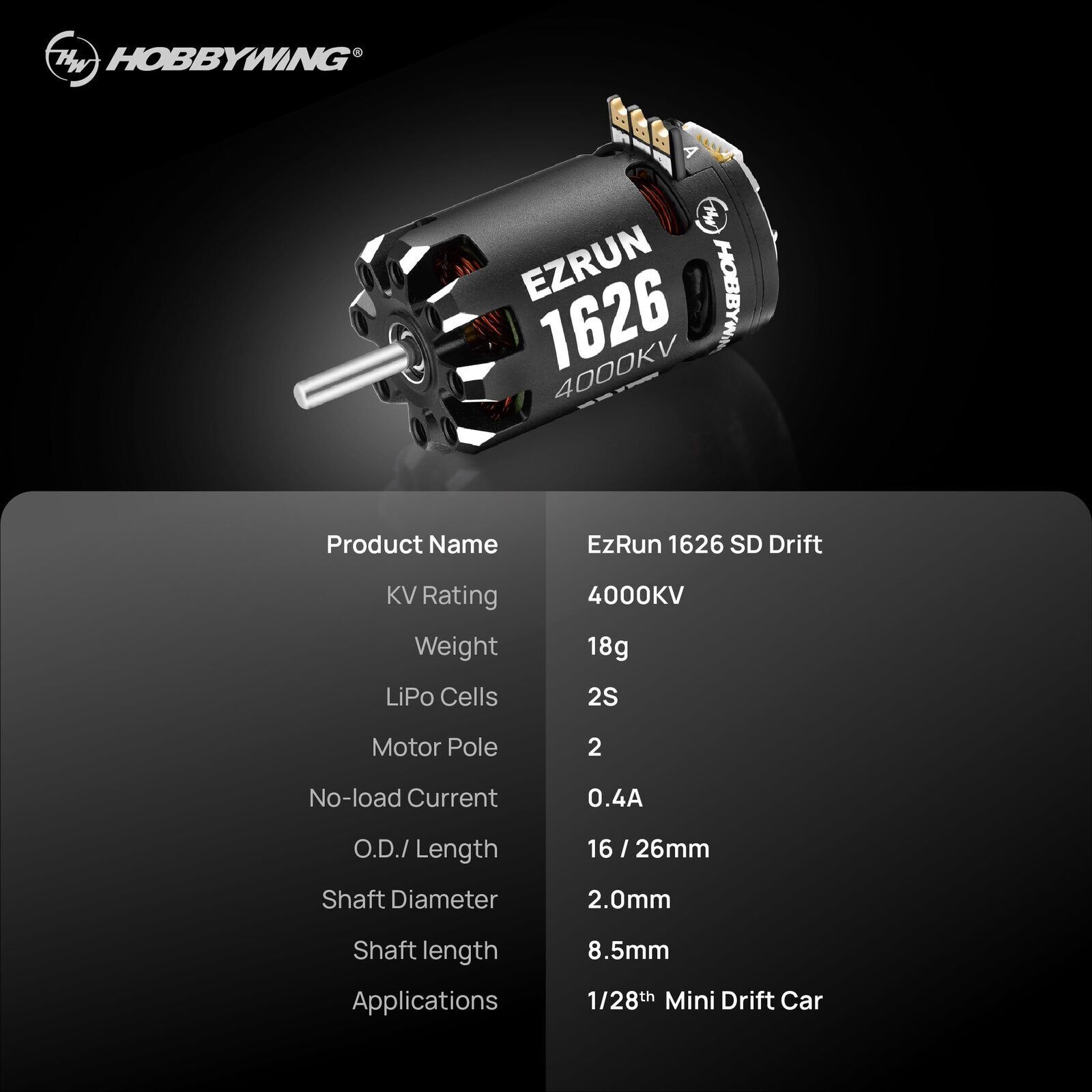 HOBBYWING EZRUN 1626SD 4000KV DRIFT BLACK MOTOR (MINI28) FEATURES Designed for high-power 1/28th scale builders Improved top speed / Precision response / High efficiency with the cool operation When used with the EzRun Mini28 ESC, timing advance can be used to increase top speeds drastically Zero cogging, consistent torque and excellent low-speed response give an amazing feel and driveability Modular detachable structure, convenient for daily cleaning and maintenance (HW30402150)