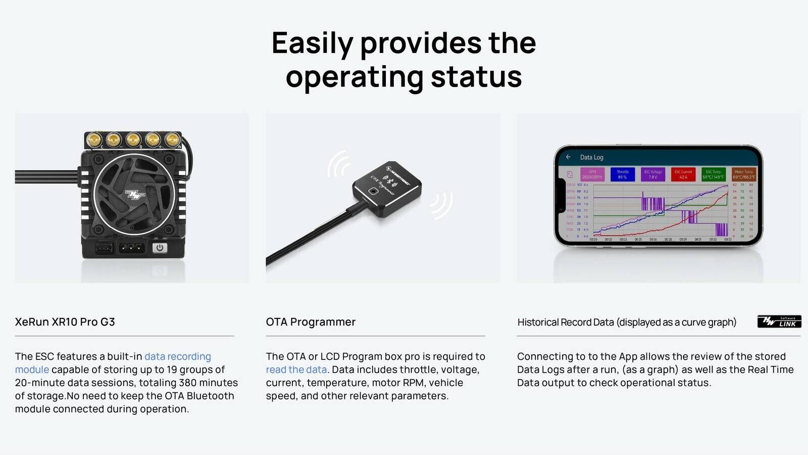 The Hobbywing XeRun XR10 Pro G3 sets new standards for competition ESCs and raises the performance level with many innovative features. Compared to its predecessor, the XR10 Pro G2S, the ESC is now equipped with a frameless and improved fan. Additionally, the optimized LCG design has reduced the height by 2 mm, leading to a lower center of gravity and improved vehicle balance. Moreover, the XR10 Pro G3 features an integrated data logging module that can store up to 19 data sets of 20 minutes each, eliminating the need for a constant connection to the OTA Bluetooth module.