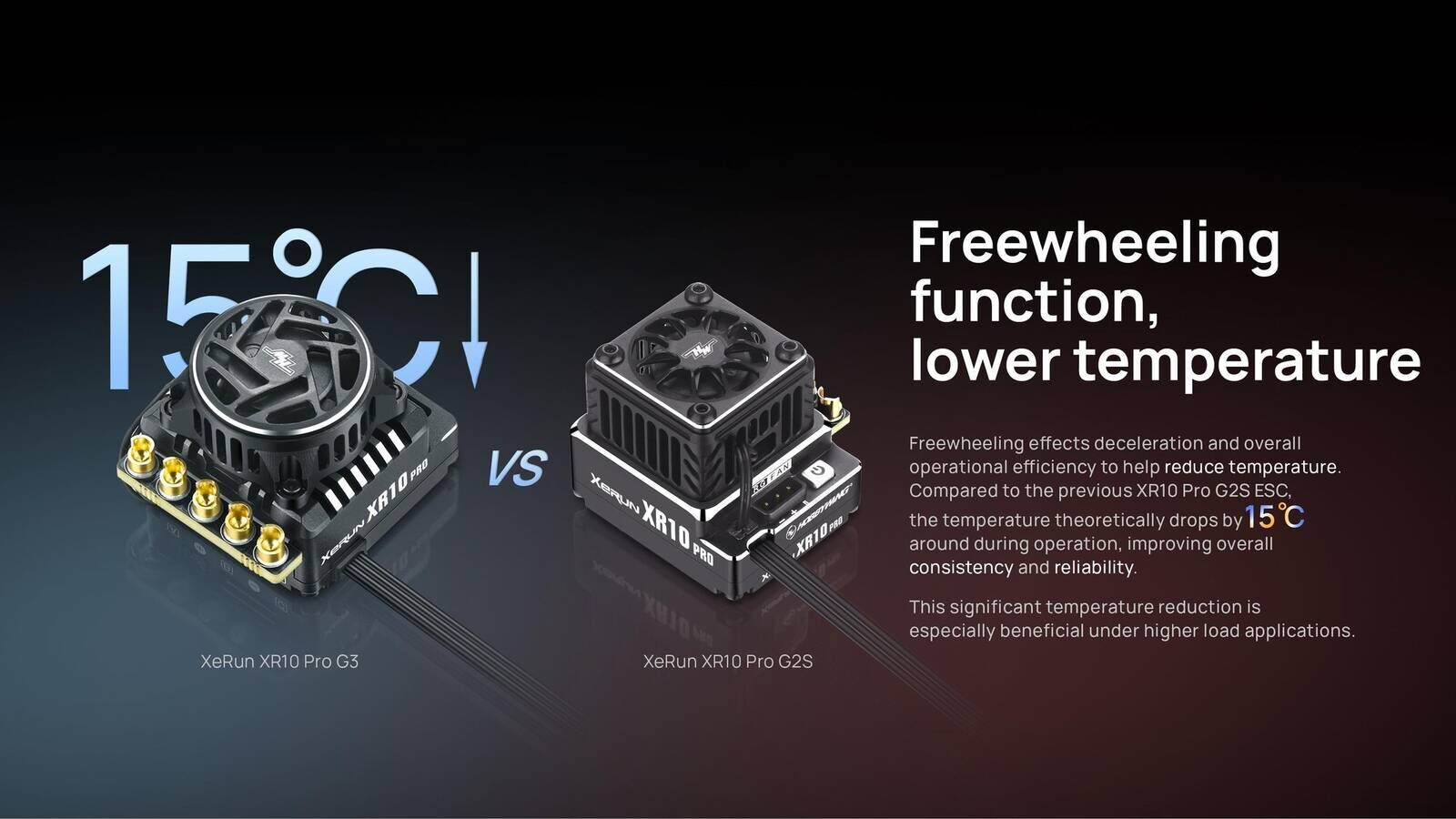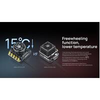 Freewheeling effects deceleration and overall operational efficiency to help reduce temperature. Compared to the previous XR10 Pro G2S ESC, the temperature theoretically drops by 15 °C around during operation, improving overall consistency and reliability.