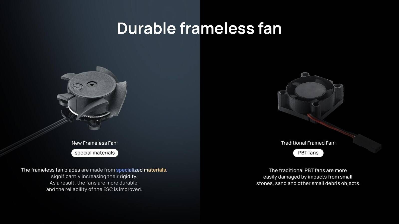 The frameless fan blades are made from special materials, significantly increasing their rigidity. As a result, the fans are more durable, and the reliability of the ESC is improved.