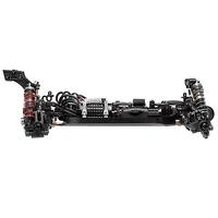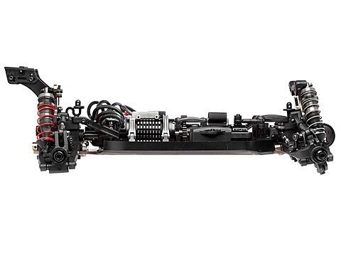 The wide buggy chassis allows all of the components of the Vorza drivetrain and electronics to sit flat on the chassis, giving the buggy a very low center of gravity for fantastic handling through turns and corners. The extra-thick 6061 aluminum chassis features side dirt guards to keep rocks and debris away from the gears and driveshafts, and a front angled section provides extra handling over rough terrain and racing tracks.