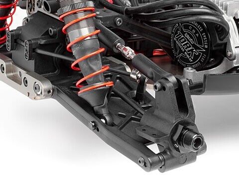 With many parts taken directly from the World Champion HB D8 racing buggy, the Vorza is ready to hit the track any time, any place! Equal-length 16mm HB Big Bore shocks smooth out the ride and provide plenty of adjustment, while the D8's solid suspension arms, knuckles and uprights take the pounding of jumps, dips and landings. Sturdy aluminum suspension mounts securely hold the suspension arms to the chassis with a steel screw and washer.