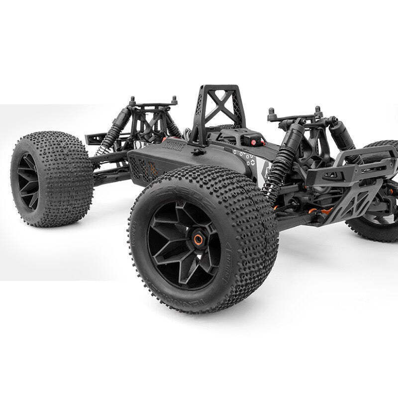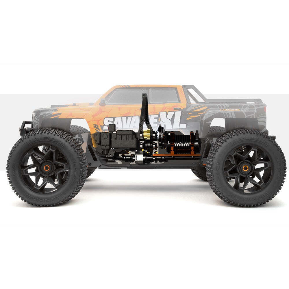 One look at the new Savage XL FLUX V2 and you know it means business! The all-new 4-door GTXL-6 'kingcab' style pick-up body fits over the XL-long 3mm thick TVP chassis which makes the truck nearly 600mm long in total! The Savage XL FLUX V2 isn t simply extended at the back like its predecessors, the totally NEW XL chassis layout extends at both the front and rear of the car for perfect driving balance and agility! For awesome stability, XL-wide 17mm axle extenders gives the truck a total width of nearly 470mm for maximum ground-stomping traction!