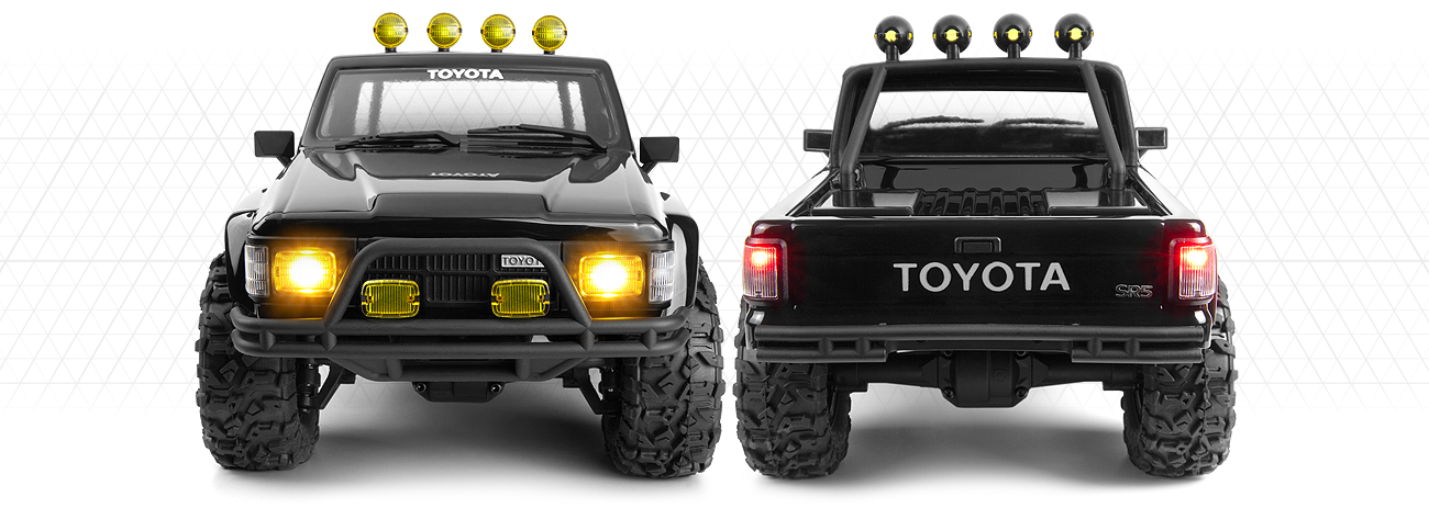The officially licensed Toyota Hilux SR5 body included with the Venture18 RTR is completely outfitted with a range of fabulous scale items. In addition to the hand-painted polycarbonate body with clear windows, you'll find a host of scale details including a pair of real side mirrors, door handles, grills, classic tube bumpers front and rear, light buckets for the working lights, dual-tube rollbar and adjustable-width rock rails that help the truck glide over tough obstacles.