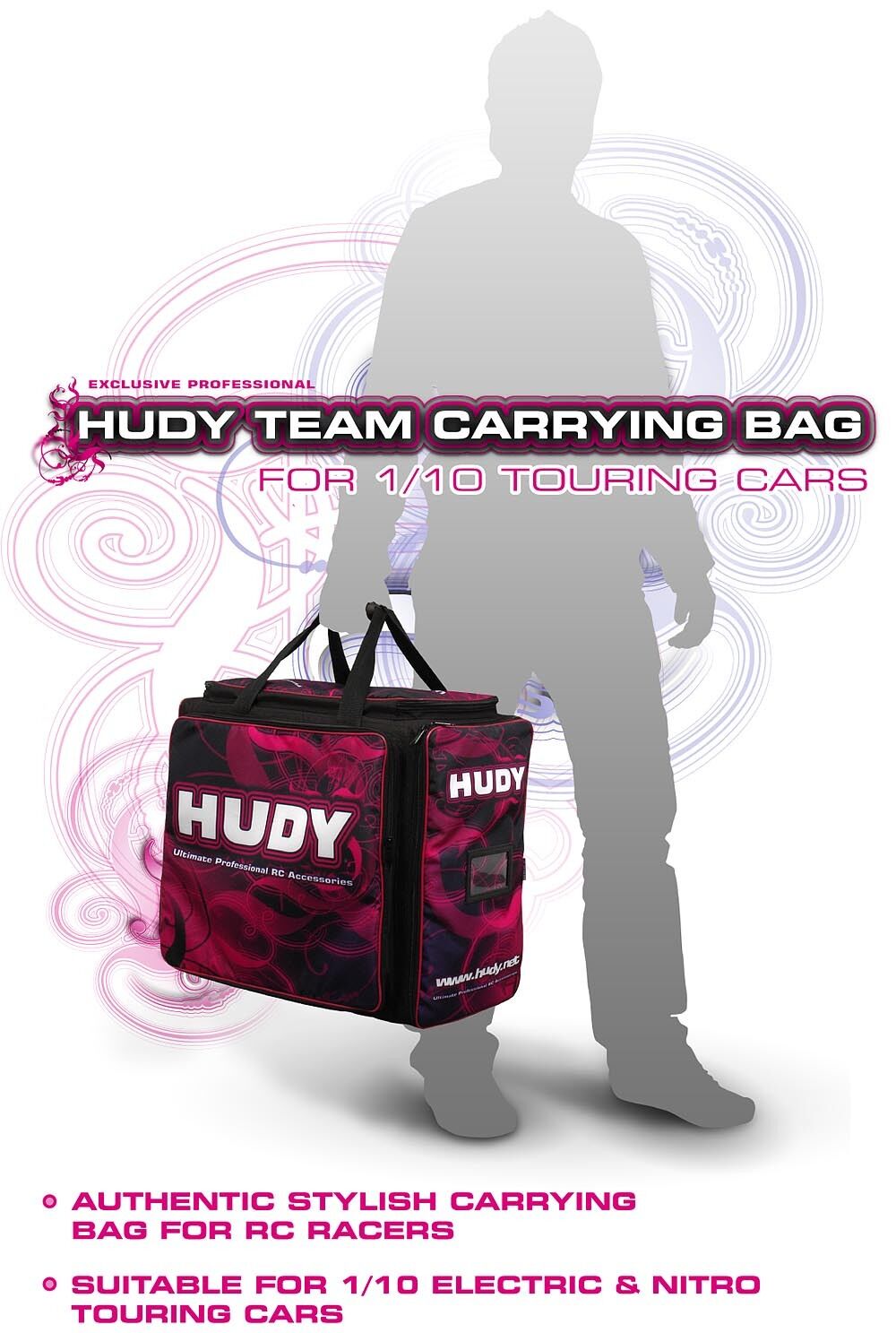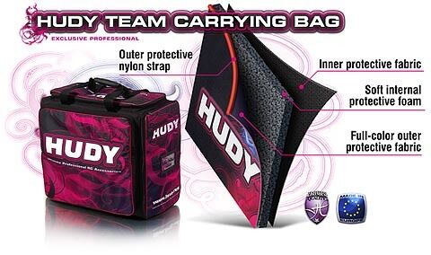 Smart, stylish and distinctive, the light and ultra-versatile hudy team carrying bag is large and spacious enough to carry your 1/10 electric or nitro touring car, rc car, tools, set-up equipment and gear to any track with comfort and ease. All walls are cushioned with protective foam, keeping your equipment safe within