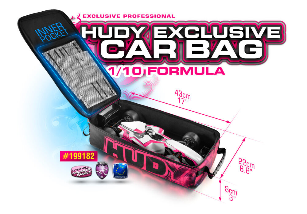 Stylish HUDY Exclusive Car Bag. With your R/C car being one of the single most important pieces of your racing equipment, it deserves all the protection it can get when traveling to AND; from races. Keeps your car safe and protected.