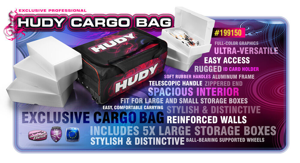Smart, stylish, and distinctive and ultra-versatile HUDY Cargo Bag to transport all your RC car equipment. The Cargo Bag is large and spacious enough to carry your tools, set-up equipment, and RC gear to any track with comfort and ease. A must have for any RC car driver.