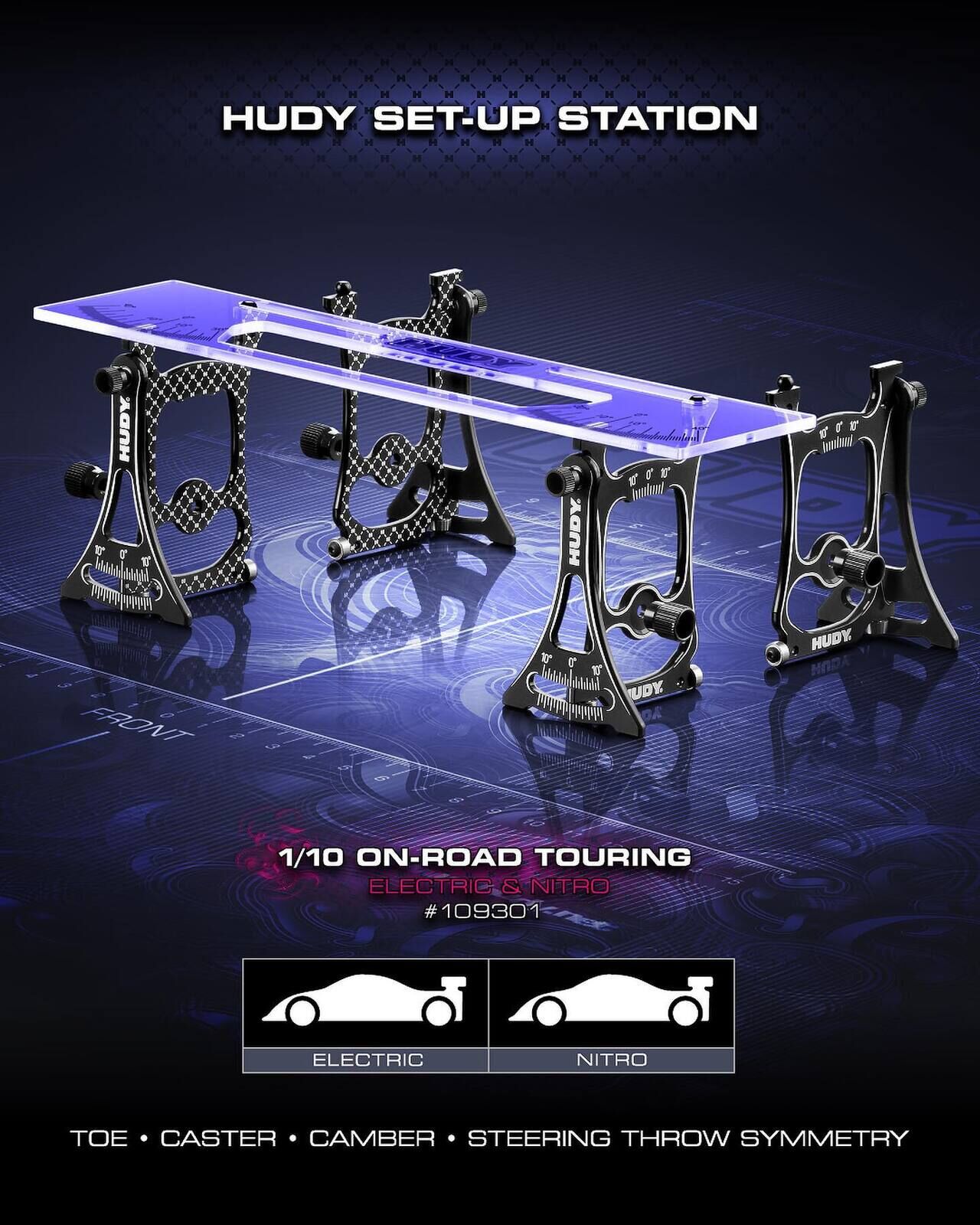 The HUDY Set-up Station for all 1/10 electric AND; nitro touring cars is a vital set-up tool used for a complete suspension geometry adjustment. The Set-up Station is used to measure and adjust the front AND; rear toe, caster, camber, camber gain and steering throw symmetry.