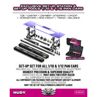 This is the 1/10 and 1/12 Pan Car Set-Up Station and Set-Up Tools with Carrying Bag from Hudy. Designed for precision, this premium-quality set-up system is ideal for pan cars, allowing accurate adjustments for camber, caster, toe, and steering throw. The CNC-machined aluminum and acrylic construction ensures durability, while the included carrying bag offers convenient storage and transport.