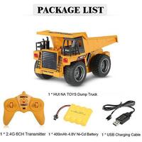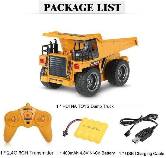 Package Includes: 1 x RC Dump Truck, 1 x 4.8V 400mAh Battery, 1 x Transmitter, 1 x USB Cable AND; Manual