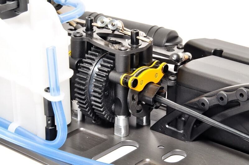 Cnc aluminum 7075 and hard anodized parts : -. All turnbuckles/ all balls/ pivot balls /rear hubs /steering racks chassis: -. 3mm lightweight hard anodized aluminum -. +5 degrees of caster angle rear suspension mount length +4mm, rear wheel hubs length +2mm. Offset total +4mm each side, more stable at high speed. Front suspension mount has more holes for lower arms to change the roll centre setup. Drive: -. 4wd drivetrain -. Hardened steel center driveshaft -. Front and rear hardened steel universal driveshaft -. 17mm rear wheels hub (length +2mm) -. Anti-loose wheel nut -. Hardened steel drive cup differential: -. Bevel gear type -. Front differential filled with #500k silicone oil -. Rear differential filled with #50k silicone oil -. New anti-leakage differential housing -. Hardened steel lightweight cup 2 speed transmission : -. 44t and 48t spur gear (mod 1, plastic gear) -. 15t/ 19t 2-speed pinion gear (mod 1, hardened steel gear) clutch -. New cnc aluminum clutch shoes -. 1. 1mm clutch springs dual brake and linkage 35mm lightweight flywheel adjustable engine mount optimized fuel tank with filter, capacity: 150cc carbon fiber servo tray and differential top plate cnc aluminum rear hub new cnc aluminum front top plate ball bearing: full set included shock absorber : -. Adjustable metal shock absorber -. Oil-filled 17mm big bore shock with #600 silicone oil and ring nut can be adjusted to change the hardness of spring -. 4mm diameter shaft shock tower: -. New 4mm thick cnc aluminum front and rear tower -. Tower plate with multiple holes for fixing the shock absorbers to change the setup suspension: -. Front and rear adjustable sway bar -. Front pbs, reinforced composite upper arms and lower arms -. Front lower with droop screw -. Adjustable roll centre of front lower arms and front upper arms extra battery box caster: adjustable camber: adjustable (hb-gt2)