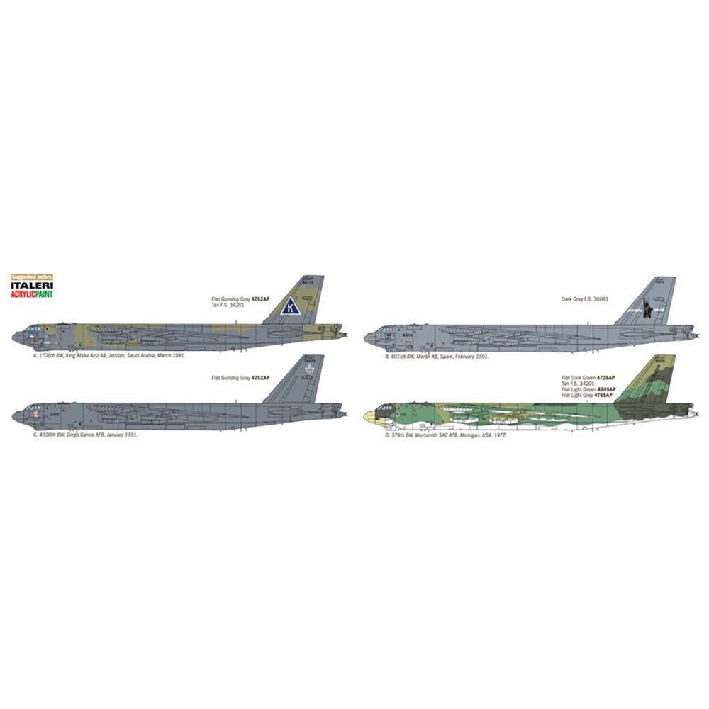 "italeri b-52g stratofortress ""gulf war"" 1:72super decals sheets for 4 versions - color instructions sheet includedthe b-52 stratofortress is the most famous long range jet-powered strategic bomber in the aviation history. Produced by the american compan"