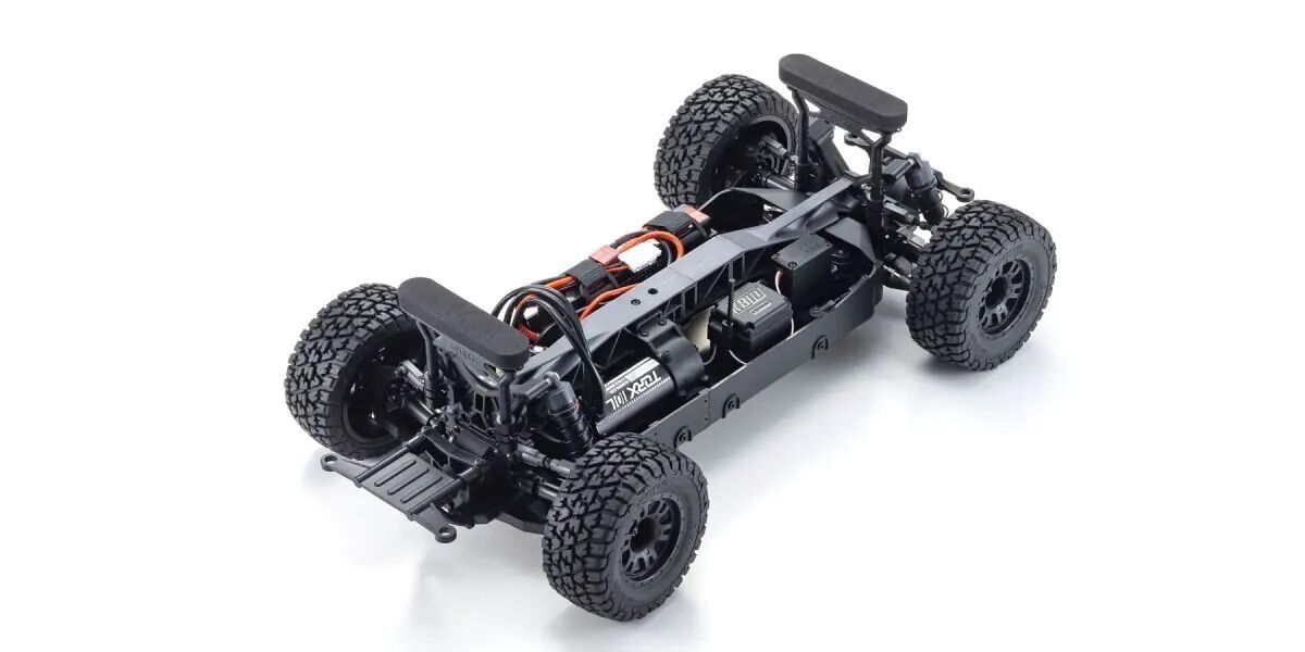 With rugged tires and undercarriage to handle rough terrain and a large rear cargo bed, pickup trucks are in high demand throughout North America, Southeast Asia, Africa, and Australia and many popular pickup trucks have been recreated as R/C models. Toyota developed the Tacoma mainly for the North American market and it has continued to sell well since its release in 1995. This model is based on the 3rd generation Tacoma which first appeared to much acclaim in 2016 due to its aggressive styling and practicality. The top of the range Tacoma TRD Pro has been recreated by Kyosho with a tough 1/10 scale chassis in a Readyset package. Kyosho s molding craftmanship immaculately reproduces the TRD Pro body in lightweight but rigid polycarbonate resin with the strength for hard off-road driving. Based on the off-road KB10 chassis, the long wheelbase and short tread of the KB10L chassis matches the body perfectly. The shaft-driven 4WD system reliably transfers the brute power of the TORX10L brushless motor to reach top speeds of about 75km/h under the management of the ESC (Electronic Speed Control) and a compatible 3S (11.1V) lipo battery. This convenient Readyset package contains the fun of an ultra-scale pickup truck on a dynamic off-road chassis with a finish similar in quality to premium display-only models.
