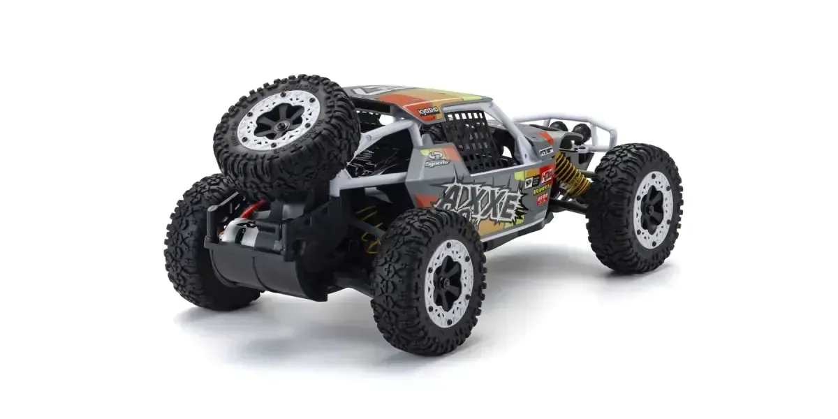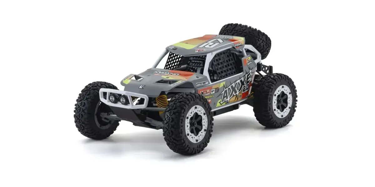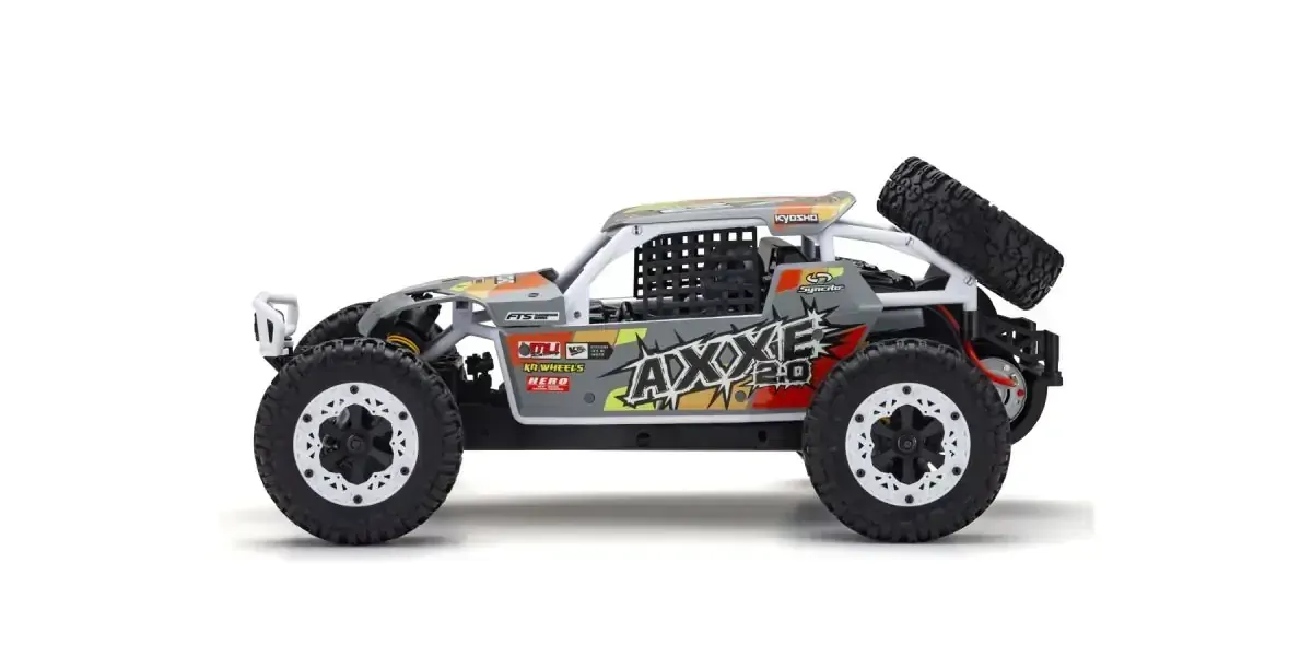 The simple design of Kyosho s electric (EP) 1/10 scale EZ series buggy delivers the perfect combination of handling, high-performance, and affordability. Since its release in 2012, the EZ series AXXE has been a popular beginner R/C car and also a great second car for more experienced drivers. Following its excellent basic design, the new AXXE 2.0 has been reborn with upgrades to its standard R/C system components and a modified body for compatibility with modern day power sources. Like its sister model the Sandmaster which was renewed in 2023, the AXXE 2.0 has undergone some changes to its chassis design to accommodate various battery types and to reduce contact of the new gearbox with the road surface. The steering servo has also been upgraded to a 6kg high-torque specification that can handle heavy offroad driving loads and the waterproof speed controller (ESC) lets you charge through puddles without a worry. With a new body color scheme, the pipe frame used in real buggy rallies and races combines white pipes with chic gray panels and new decal designs. Choose from two different AXXE 2.0 body color patterns! Sold as a Readyset including body and pre-assembled chassis with R/C system installed, all you need to enjoy R/C car action is a battery for the car, battery charger, and batteries for the transmitter. The simple design structure is easy to disassemble and reassemble, which is optimal for maintenance and tuning.