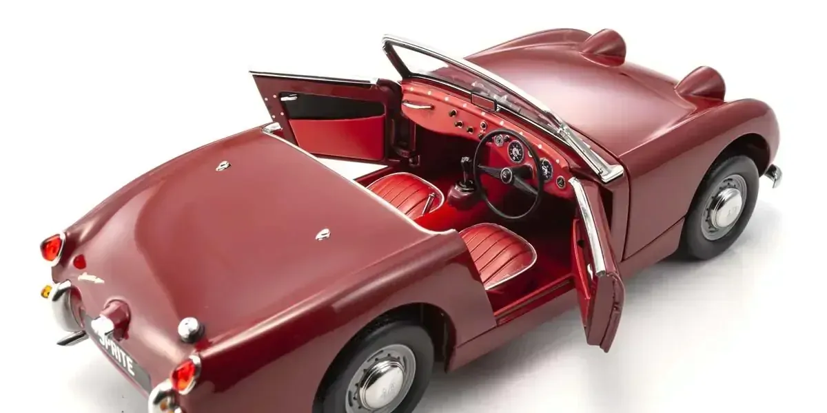 The Sprite entered the Austin Healey line-up in 1958 as the entry sports car model developed by BMC (British Motor Corporation) which existed from 1952 to 1966. Conceived as a small sports car for mass appeal, the minimalist engine and undercarriage were designed to keep costs down. Weight reduction was also a focus, and the Sprite adopted the world s first semi-monocoque open body. While the 948cc inline 4-cylinder engine output was only 43ps, this was sufficient power for the 600kg vehicle weight (less than modern light vehicles ), which was the highest power to weight in its class at the time.