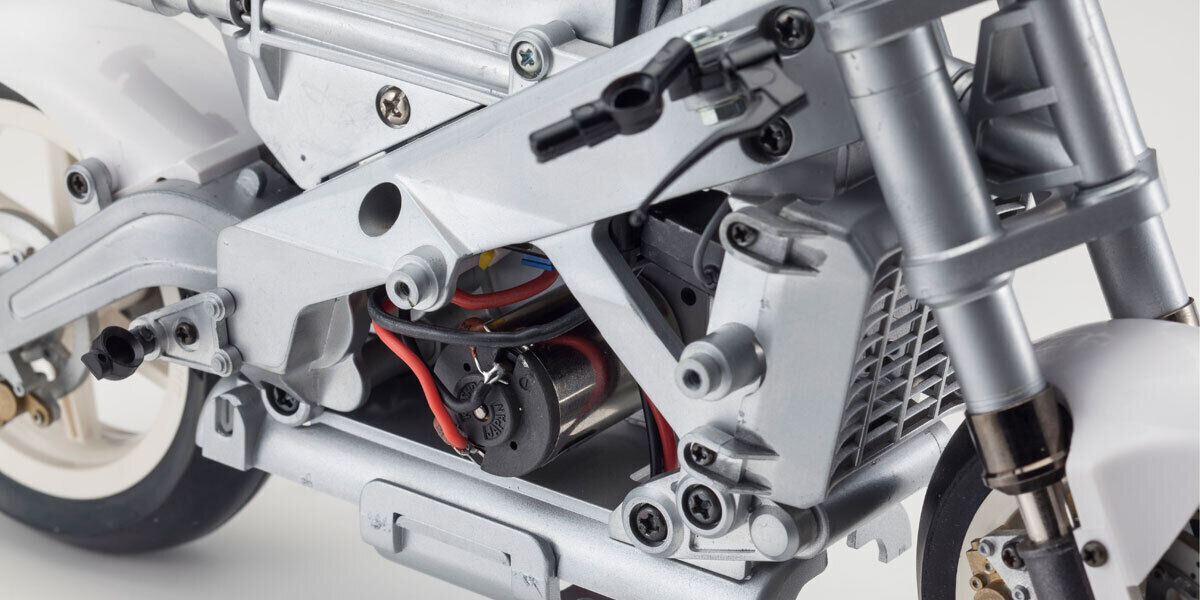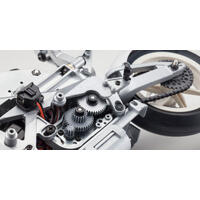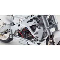 The S.D.S.S (semi direct steering system) delivers high performance fully independent motion with the rider figure construction incorporating 13 different connections so it hangs on to the bike as it leans into corners. The result is driving performance just like a real motorbike that is easy enough for anyone to control. In addition, each section of the bike is designed with an incredible level of scale detail from the body cowl, inverted front fork suspension, brake disk AND; calipers, wheels, drive chain, sprocket and asymmetrical swing arm to recreate a model of display standard quality. However, as only a few parts are used in construction, even beginners can enjoy the satisfaction of the assembly that only takes a short time to complete. Dive deep into the fascinating realm of R/C electric motorbike driving like never before and discover the pure enjoyment of building, displaying and driving your own Hanging On Racer.