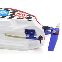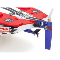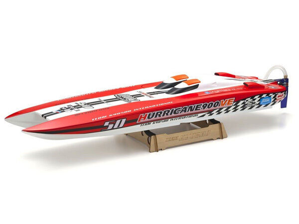 You won't believe your eyes at this stunningly realistic recreation of a C-1 class catamaran. Built to an interior display standard, you cannot help but admire the sleek form and the high-quality finish. However, the HURRICANE 900VE is not known just for its scale appearance. Setting the benchmark for 900mm class electric racing boat performance, the precision-crafted pre-painted FRP hull is the embodiment of KYOSHO's many years of R/C boat design know-how and incorporates the latest KYOSHO SPEED HOUSE water-cooled brushless motor and water-cooled ESC with maximum current of 120A. Combined with the precision angle of the wire drive, the hull accelerates from a standing start with minimal cavitation from the propeller to its planning posture in next to no time. Speed increases quickly after the lift from the initial acceleration as the characteristics of the low-profile catamaran hull design deliver high-speed performance across the water.