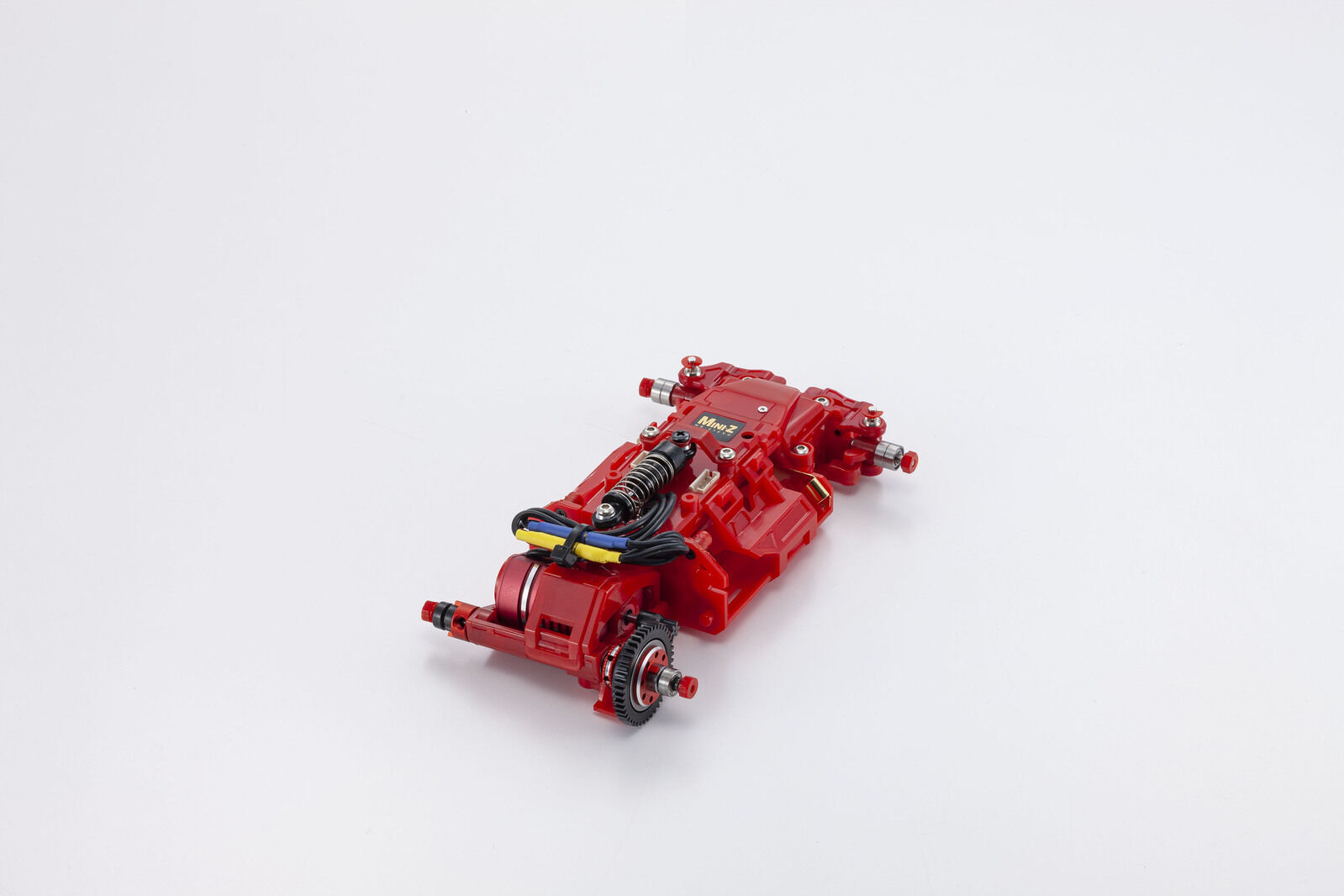 The existing MINI-Z is installed receiver, servo and ESC by 1 controlled PCB unit. But the new MR-03EVO Chassis Set has separate receiver as 1 unit. By purchasing and installing an optional receiver unit depending on applied transmitter, it allows for Kyosho (EX-6R/KT-531P), KO Propo (EX-2/EX-RR), Futaba (T7PX/T7XC/T4PM), and Flysky (Noble NB4) transmitters. Further, by installing new CPU which control servo function only, it improves internal feedback of positioning control which is 11.2 times faster than existing VE PRO models. The newly developed control program realizes the best ever steering feeling in the MINI-Z history. The ESC also improves the response speed in maximum 100 times faster than existing VE PRO models. The included KYOSHO SPEED HOUSE XSPEED 85 (8500KV) brushless motor features a one-piece aluminum case that provides efficient heat dissipation for superior cooling. Unlike previous chassis sets, you can change to the brushed motor mode through the I.C.S manager to install an optional brushed motor. The I.C.S manager also allows more precise setting adjustments to be made. New advanced performance features in the MR-03EVO take the MINI-Z racing experience to the next level! The SP edition is equipped with nickel plated hex screws and an oil shock (MZW432) as standard. Also, the ball diff is specially finished with red anodizing. Furthermore, new upper arms with various caster angles (1 deg./2 deg./3 deg.) are included allowing wider setting range. The Red Limited version newly features red plastic parts throughout the chassis that are nicely coodinated with the red anodized motor and ball diff.
