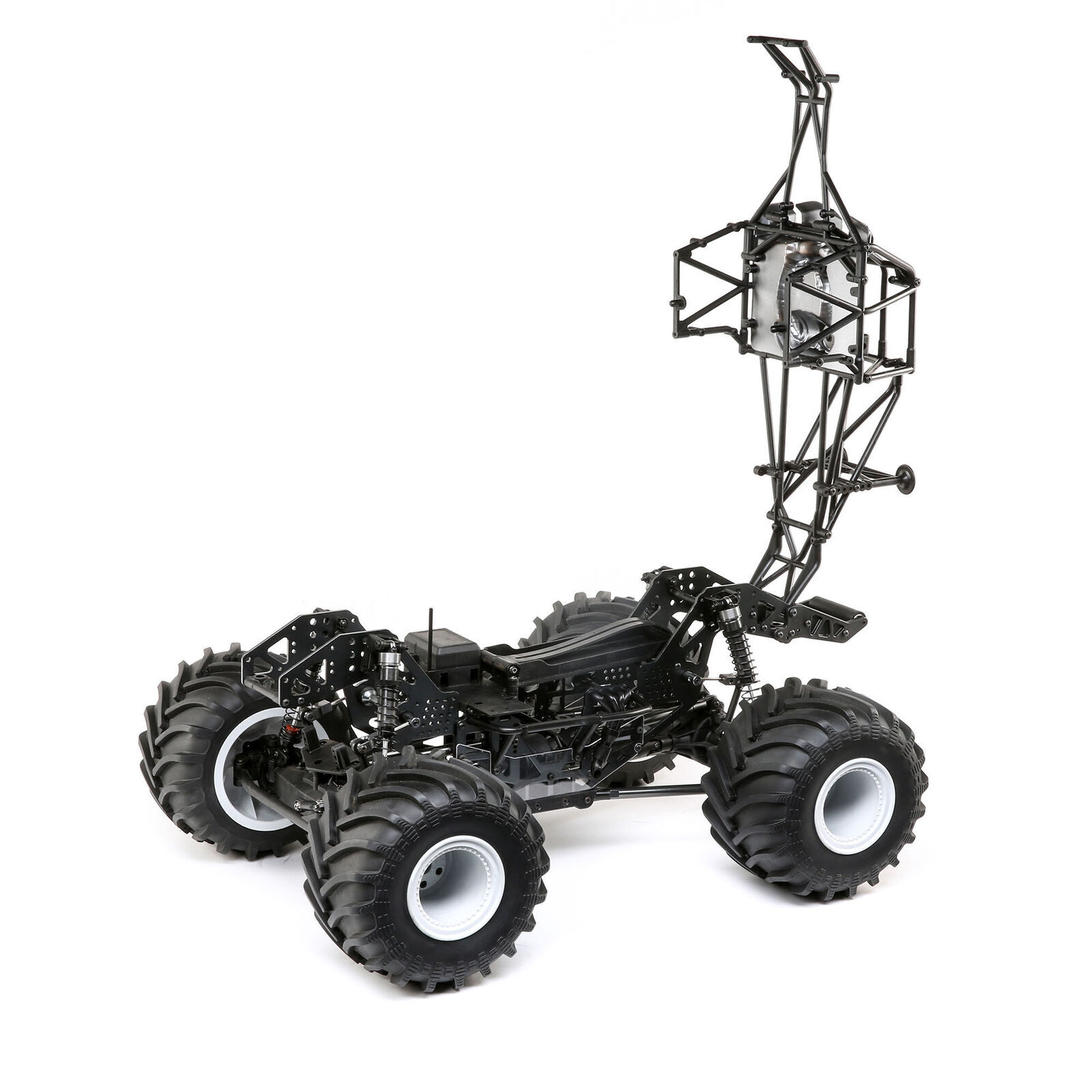 Completely designed from the ground up, the losi lmt 4wd solid axle monster truck roller is the first of its kind on the market combining all-out performance with incredible scale detail. Starting with the chassis, a twin vertical plate is designed to provide all the performance adjustments needed to tune the truck for any situation. Whether you are a scale driver, a basher or a racer, the chassis is designed to accommodate multiple shock setups keeping you tracking straight, no matter the terrain. New multi-piece axle housings surround the 1/8th scale drivetrain. Additionally, the easy access centre transmission comes stock with a centre differential and allows for quick changes with the optional spool for that wheel standing action. For the true monster truck experience, the axles also allow for optional 4-wheel steering and a new adjustable servo saver to keep the wheels pointed in the right direction. A composite flip top cage adds scale realism and protection, as well as functionality so you can easily access your battery and electronics. Choose your preferred peripherals such as a transmitter, battery, charger, motor and more for a complete custom setup. The lmt monster truck roller has just thrown down the gauntlet on solid axle monster trucks.