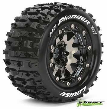 Louise MT-PIONEER 1/10 Monster Truck MFT Tires on Black-Chrome 1/2"" Offset Bead-Lock Wheels These 1/10 monster truck tires have the perfect construction to suit loose surfaces where you want good forward traction. These MT-PIONEER tires are also equipped with the latest MFT technology with an molded-in cord that helps reduce any over ballooning that is hurting performance due to less contact patch to the surface you drive on. To top it off Louise have also included an over-sized 3.2"" wheel with an bead-locking ring on each side that is hold in place with ten screws per side - no glue joint that can tear apart! Tire Features: MFT (Micro Fiber Tech) Less Ballooning More rigid overall structure Less distortion Stable and even contact with the road/off-road surface Larger outer diameter vs normal 2.8"" MT tires Wheel Features: Over-Sized 3.2"" diameter Bead-lock System Rigid locking ring that securely locks the tyre bead to the wheel with 2x10pcs M3x6mm hex screws without using a tyre glue Fits: Traxxas STAMPEDE 2WD Front Traxxas STAMPEDE VXL 2WD Front Traxxas SKULLY 2WD Front Traxxas CRANIAC 2WD Front Traxxas BIGFOOT 2WD Front Traxxas STAMPEDE 4x4 Front & Rear Traxxas STAMPEDE VXL 4x4 Front & Rear Traxxas Nitro STAMPEDE 2WD Rear Also fits other 1/10 Scale Trucks with 12 mm hex Specs: Wheel diameter: 3.2"" Tire Diameter: 133 mm Tire Width: 70 mm Weight (each): 259 g Hex: 12 mm Offset: +1/2"" Tire Compound: Soft Tire Tech: MFT (Micro Fiber Technology) Wheel Finish: Black-Chrome Nylon Wheel Type: Bead-Lock with 2x10pcs of M3x6mm hex screws Foam: Yes Glued: No Notes: Check the over all gearing as these tires may be larger in diameter vs a normal 1/10 Stadium Truck tire which may need a smaller motor pinion gear We recommend updating your steering servo when using these tyres as they provide more grip and may overload a standard servo (LT3308SBCH)