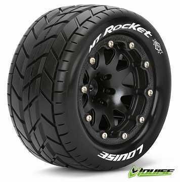 These 1/10 monster truck tires have the perfect construction to suit any hard driving on smoother surfaces due to their MT-ROCKET street thread. They are also equipped with the latest MFT tire technology with an molded-in cord that helps reduce any over ballooning that is hurting performance due to less contact patch to the surface you drive on. To top it off Louise have also included an over sized 3.2" wheel with an bead-locking ring on each side that is hold in place with ten screws per side - no glue joint that can tear apart!