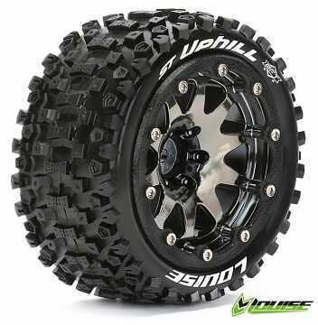 Louise ST-UPHILL Stadium Truck MFT Tires on Black-Chrome 0-Offset Bead-Lock Wheels These 1/10 stadium truck tires offers a good combination of forward and side traction on most loose gravel surfaces. They are equipped with the latest MFT tire technology with an molded-in cord that helps reduce any over-ballooning that is hurting performance due to less contact patch to the surface you drive on. To top it off Louise have also included an over sized 3.2"" wheel with an bead-locking ring on each side that is hold in place with ten screws per side - no glue joint that can tear apart! Tire Features: MFT (Micro Fiber Tech) Less Ballooning More rigid overall structure Less distortion Stable and even contact with the road/off-road surface Larger outer diameter vs normal 2.8"" ST tires Wheel Features: Over-Sized 3.2"" diameter Bead-lock System Rigid locking ring that securely locks the tyre bead to the wheel with 2x10pcs M3x6mm hex screws without using a tyre glue Fits: Traxxas RUSTLER 2WD Rear Traxxas RUSTLER VXL 2WD Rear Traxxas STAMPEDE 2WD Rear Traxxas STAMPEDE VXL 2WD Rear Traxxas SKULLY 2WD Rear Traxxas CRANIAC 2WD Rear Also fits other 1/10 Scale Trucks (stadium & monster) with 12 mm hex Specs: Wheel diameter: 3.2"" Tire Diameter: 123.5 mm Tire Width: 56.5 mm Weight (each): 198 g Hex: 12 mm Offset: 0"" Tire Compound: Soft Tire Tech: MFT (Micro Fiber Technology) Wheel Finish: Black-Chrome Nylon Wheel Type: Bead-Lock with 2x10pcs of M3x6mm hex screws Foam: Yes Glued: No Notes: Check the over all gearing as these tires may be larger in diameter vs a normal 1/10 Stadium Truck tire which may need a smaller motor pinion gear We recommend updating your steering servo when using these tyres as they provide more grip and may overload a standard servo (LT3313SBC)