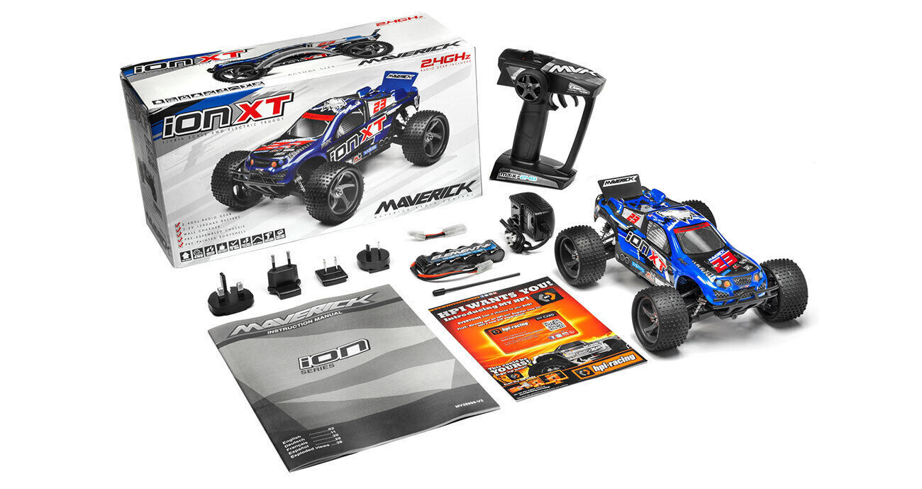 Maverick rc's reputation for affordable fun continues with the hugely impressive ion xt! this 1/18th scale racing truck gives you the thrilling excitement of much larger rc buggies in a package that fits in the palm of your hand! waterproof electronics, 4wd grip and large off-road tires mean you can turn anywhere you go into your own rc playground!