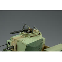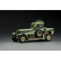 This 1/35 British R-R Armored Car Pattern 1914/1920 model features accurately replicated vehicle structure and exteriors and rich details. It can be built as a WWI option or WWII option. The roof machine gun mount is rotatable. Clear light parts and PE parts are included. WWI and WWII paint schemes are provided.