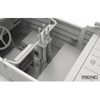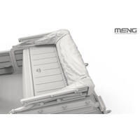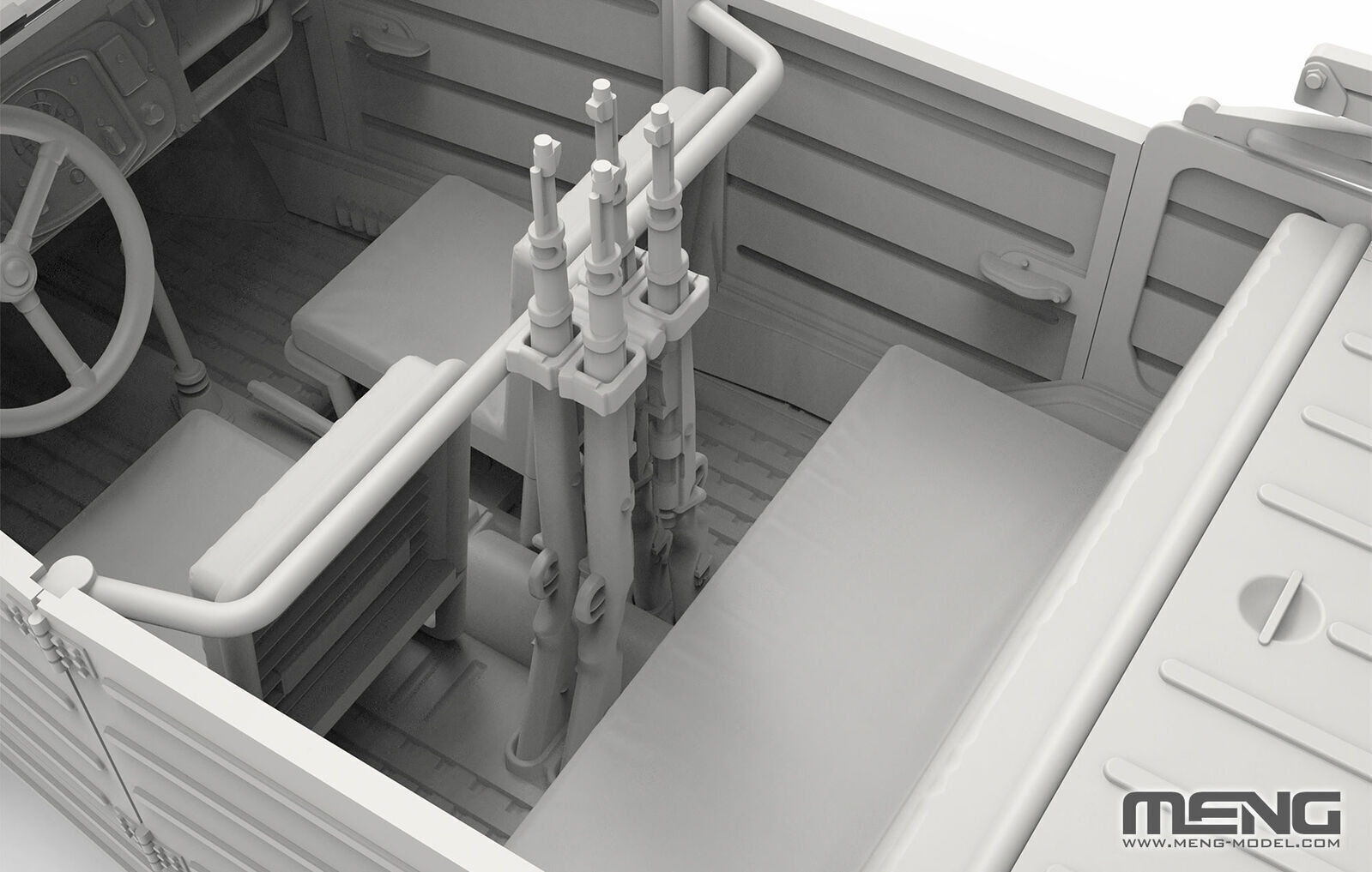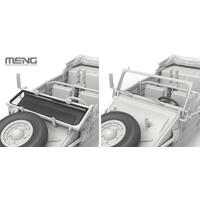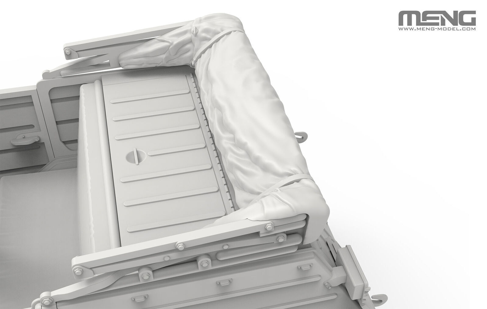 This model kit from Meng includes a blackout cover (you can choose its shape), and the windshield can be built in use, or in its stored state. A fuel tank and spare tire are included as well.