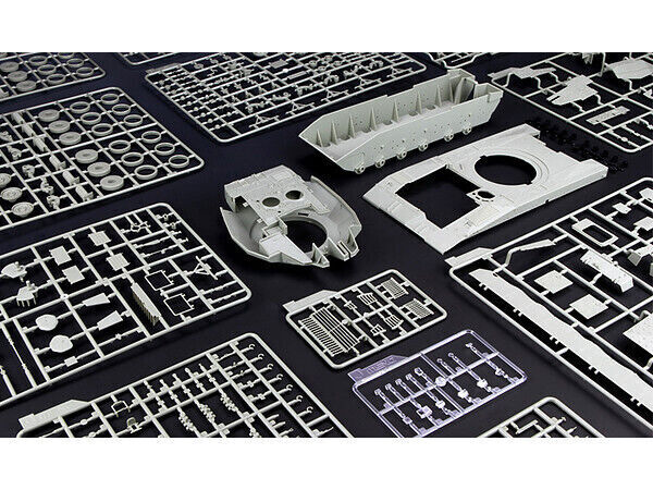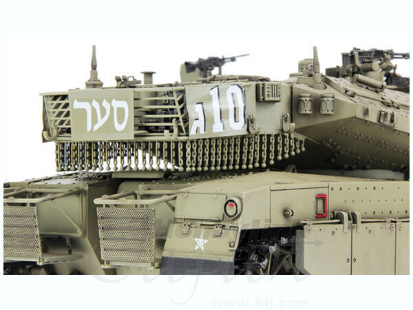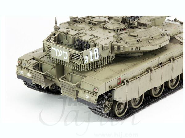 the merkava mk. 3d mbt model kit in 1/35 scales with length 258mm and width 111mm. Precise reproduction of the turret characteristics of the merkava mk. 3d. Two options for road wheels and driver. S hatch. The headlights can be opened and closed as you like. All periscopes can be made open and closed. The subtle tie-downs at the rear of the turret are easy to assemble. Two options for painting styles.