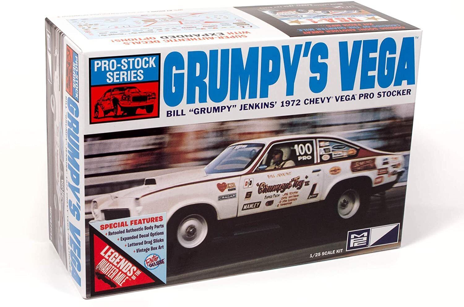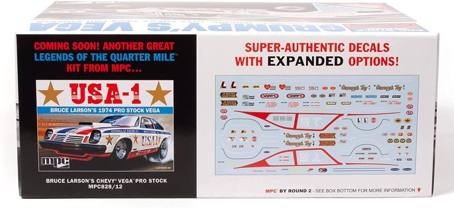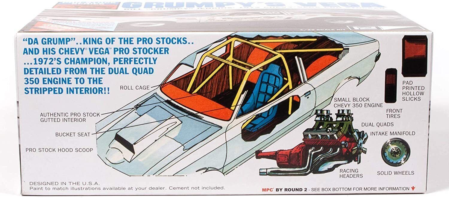 HIGHLY SOUGHT AFTER VINTAGE DRAG RACER: MPC’s 1/25 scale Grumpy’s ’72 Vega has been requested by modelers for decades and now it’s back! It’s simple enough project for beginners but with enough detail to satisfy even the most seasoned model builder! Many parts have been completely retooled from the ground up for outstanding authenticity!