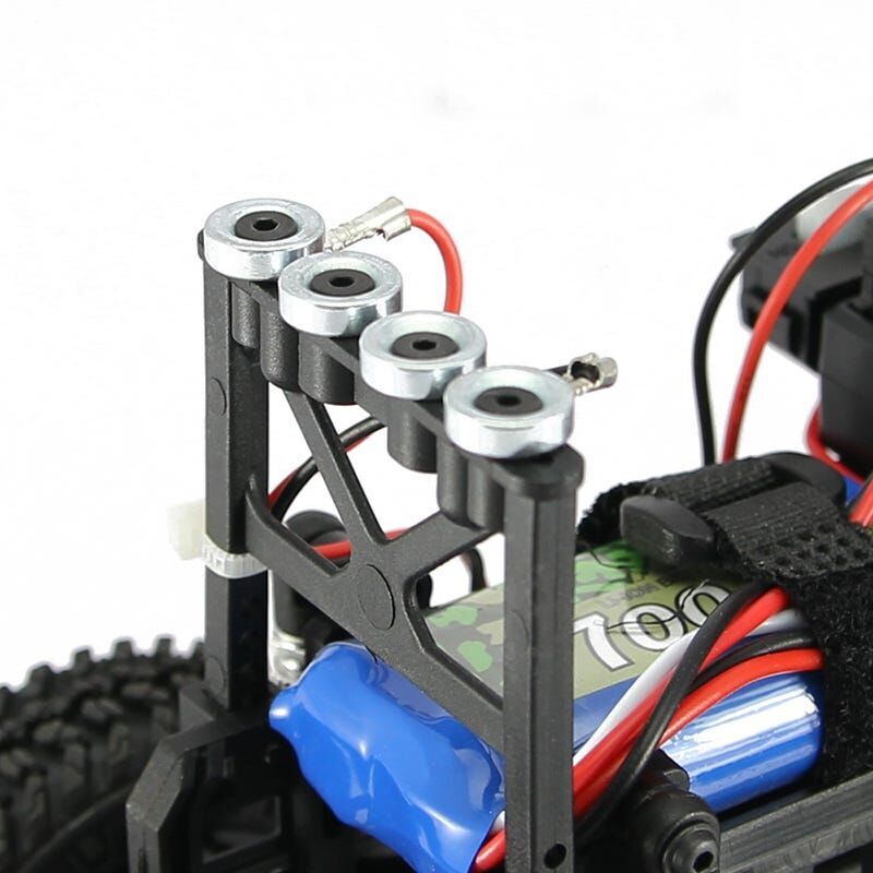 The Tetra is also ready to light up the trail. The X series lighting system includes 8 LED's - 4 front and 4 rear-facing lights. The system is controlled by the transmitter, featuring four distinct light settings - off, solid, slow flash, and strobe. The brake input on the transmitter activates the white reverse lights while turning left or right activates the blinkers. The Tetra 1/24 is ready to get the party started both day and night.