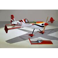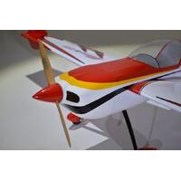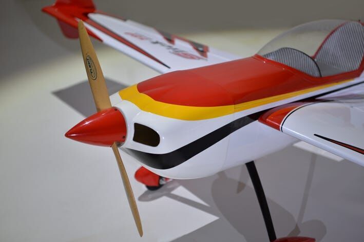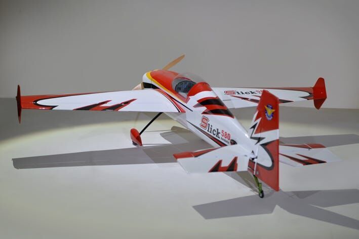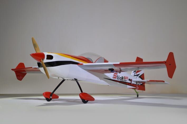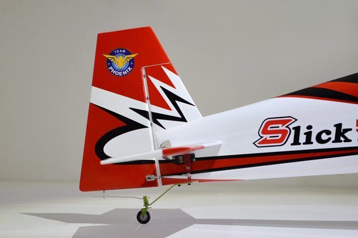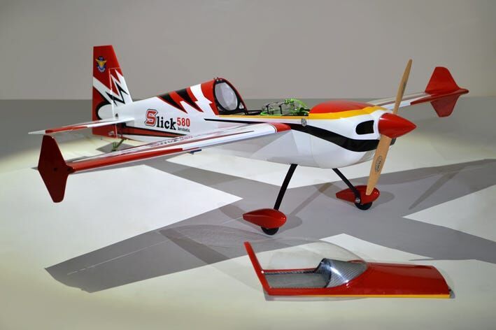 The Phoenix Model Slick 580 30-40cc is compatible with both engine and electric. Gasoline 30cc to 40cc, and the glow engine is 160 (4C) class. The fuselage is covered with balsa and veneer film, the tail is fixed with balsa film (not detachable), and the main wing is split left and right and covered with balsa ribbed film, the cowl is glass painted, and the film is ORACOVER. Winglets are attached to the wingtips to improve the float at the knife edge. Although it is entirely made of wood, there are parts where a carbon sheet is affixed to the plywood mirror surface, which reduces weight and increases strength.