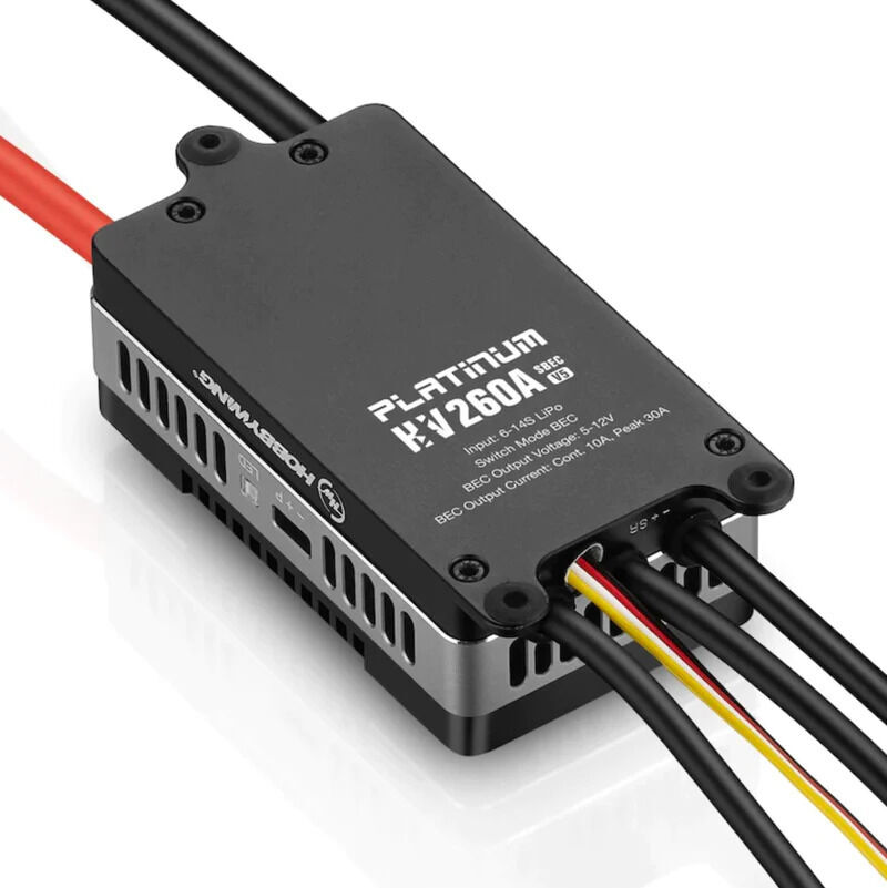 Product information ""hobbywing platinum pro 260a hv esc 6-14s, 10a bec"" the platinum v5 260a hv v5 provides constant speed control, ensuring an excellent flying experience with its powerful 12v switch-mode bec. The innovative housing design, featuring additional windows on the sides and internal structure, enables highly effective heat dissipation. This allows the generated heat to be directly transported from the circuit board to the outside through the shortest path. This is particularly necessary because the integrated 32-bit processor enhances the rpm algorithm's precision, thereby further strengthening the overall performance of the platinum esc (electronic speed controller). The finely adjustable speed sensitivity ultimately allows every pilot to find a setting that suits them perfectly. The esc also incorporates efficiency optimization technology with synchronous rectification (deo: ""driving efficiency optimization"" - active freewheeling), which brings several advantages at once: - faster throttle response, improved flight stability, and flexibility. - higher driving efficiency and longer battery life. - lower temperature increase of the esc, ensuring reliability. Features: efficient cooling through a sophisticated heat dissipation system with windows built-in 12v switch-mode bec (5-12v) supports multiple data protocols, e. G. , mikado vbar system, futaba s. Bus2, msh brain, and ikon includes data recording accessible via the ota module on the smartphone multiple protection features 16 adjustable parameters, including 4 flight modes: fixed wing helicopter - external governor helicopter - express governor helicopter - store governor technical specifications: type: brushless high voltage current cont. /peak: 260a/400a cells: 6-14s lipo bec: 5-12v @10a (switch mode) cable battery/motor: 1x 8awg (red, black) 3x 10awg (black) programming: - lcd programming box - ota bluetooth programmer - seperate programming port firmware upgrade: yes telemetry: mikado vbar;futaba s. Bus2; msh ikon;brain and etc. Dimensions: 89x50x34mm weight (incl. Cable): 297g application: 700-800 electric helicopter (main rotor length: 690-880mm) delivery: 1x esc platinum v5 260a hv sbec 1x manual optional accessories: hw30502001 lcd programming box hw30850400 ota bluetooth programmer (hw30203100)