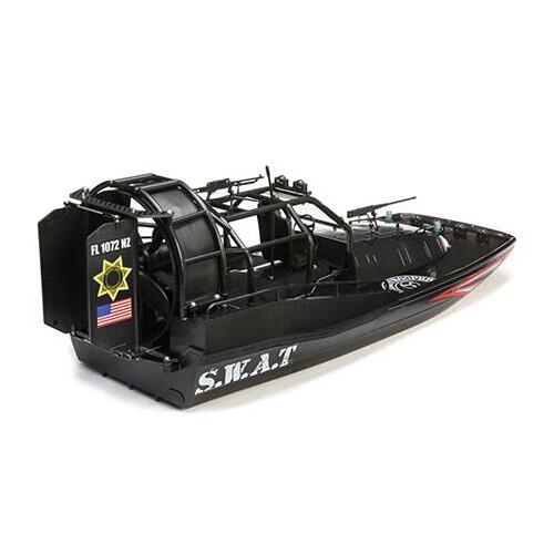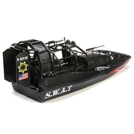 Run the Pro Boat Aerotrooper 25-inch Brushless Air Boat practically anywhere. Even on land! Featuring an 2080kv 480 Brushless outrunner motor with 3-blade airplane-style prop mounted above the hull, you can explore large bodies of water, plant-infested swamps, small grass fields, and even snow and ice. Keeping with the theme, a tactical/military hull scheme with removable guns, molded handrails, and cage add to the scale realism. Plus, the scale cockpit with seat and steering fits most action figures. Injection molded two-piece composite canopies are durable with a secure restraint system keeping all electronics safe during use. LED lights mean the fun doesn t stop when the sun goes down. Explore new terrain with a one-of-a-kind boating experience.