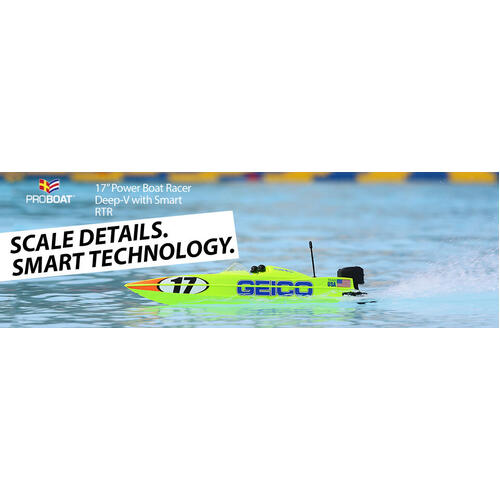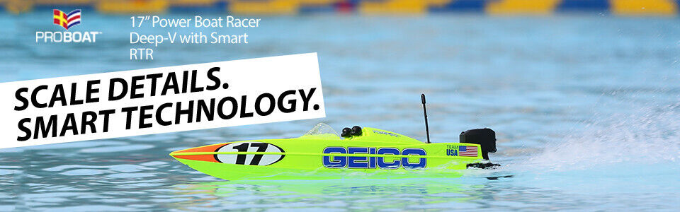 Push the limits of brushless boating with the revolutionary Pro Boat Power Boat Racer Deep-V, a 17-inch Self-Righting boat with Smart Technology. Featuring two exciting trim schemes ¢ ¬ Lucas Oil and Miss GEICO, adding to the realism ¢ ¬ plus cutting-edge technology, this boat has it all! The perfect Deep-V for anyone from the beginner to the avid boater, it offers performance capable of hitting 30+ MPH and a worry-free self-righting feature that flips the boat back upright in a matter of seconds. It comes with a Spektrum ¢ ¢ S120 USB-C Smart Charger and 1300mAh 3S 11.1V Smart LiPo Battery 30C with IC3 connector allowing you to take complete control of charging and maintaining battery life. No matter your skill level, the Power Boat Racer features everything experts and beginners alike want in a Deep-V.