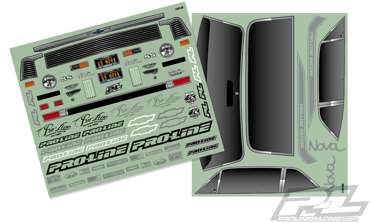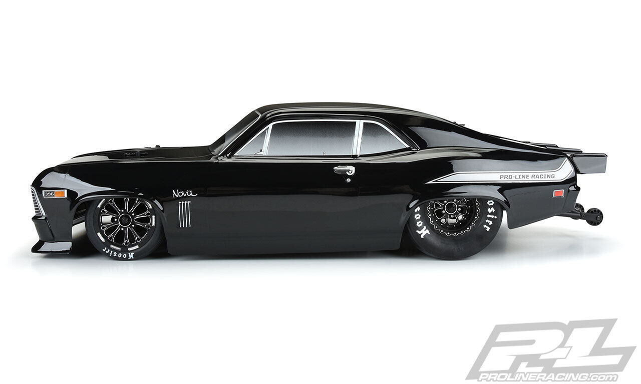 This is a 1969 Chevrolet Nova ¢ ¢ Drag Car Tough-Color Black body. Pro-Line is proud to introduce the iconic 1969 Chevrolet Nova ¢ ¢ Tough-Color Black body specifically designed for the growing SC Drag Racing scene! This body is perfect for No-Prep Drag Racing and features an ultra-realistic one-piece body design and includes an optional add on spoiler to complete the drag racing look. No more messing with separate nose pieces to achieve scale front end detail! The Nova ¢ ¢ is now available in completely black polycarbonate Tough-Color material, so you never have to worry about paint peeling or chipping off. Realistic window stickers are also included!