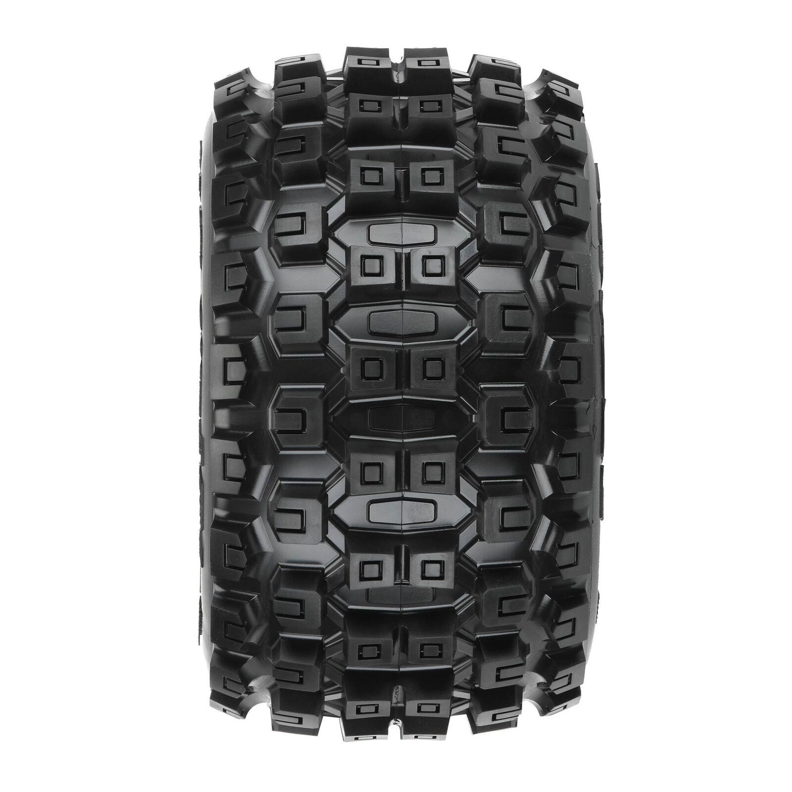 This is a pair of pre-mounted Badlands MX38 Tires. Pro-Line is taking the 3.8" tire game to the next level with the Biggest and Baddest tire ever conceived: the Badlands MX38! Pro-Line Badlands tires are known for having a sweet Motocross inspired tread and the all-new Badlands MX38 tires kick that up a notch with a Bigger and Bolder knobby tread that matches modern MX tire design. The Badlands MX38 is a true All-Terrain tire that will find traction on any surface but is best suited for loose AND; loamy dirt, mud or grass. Just imagine your truck throwing up huge rooster tails with these awesome looking tires!