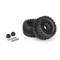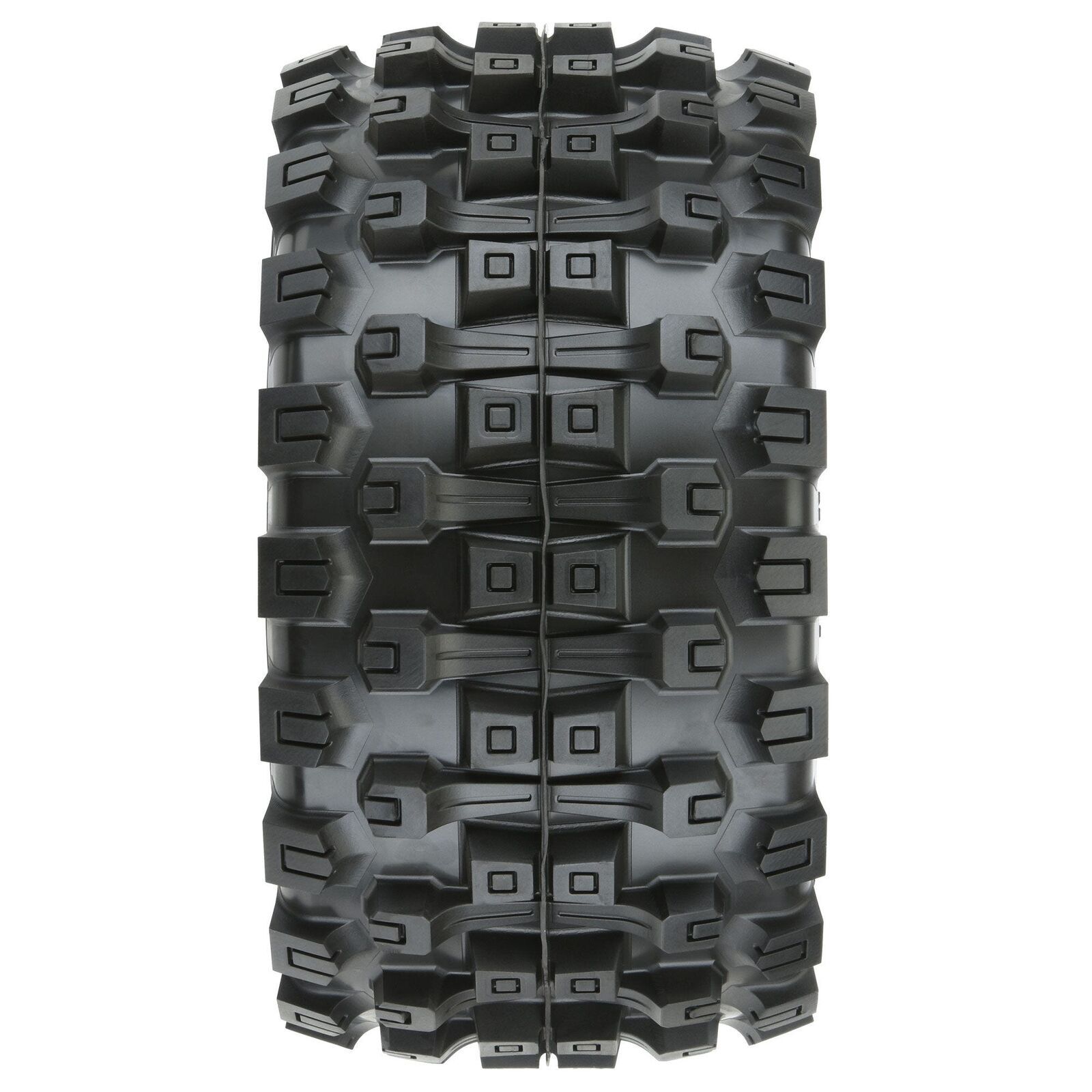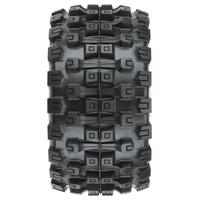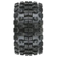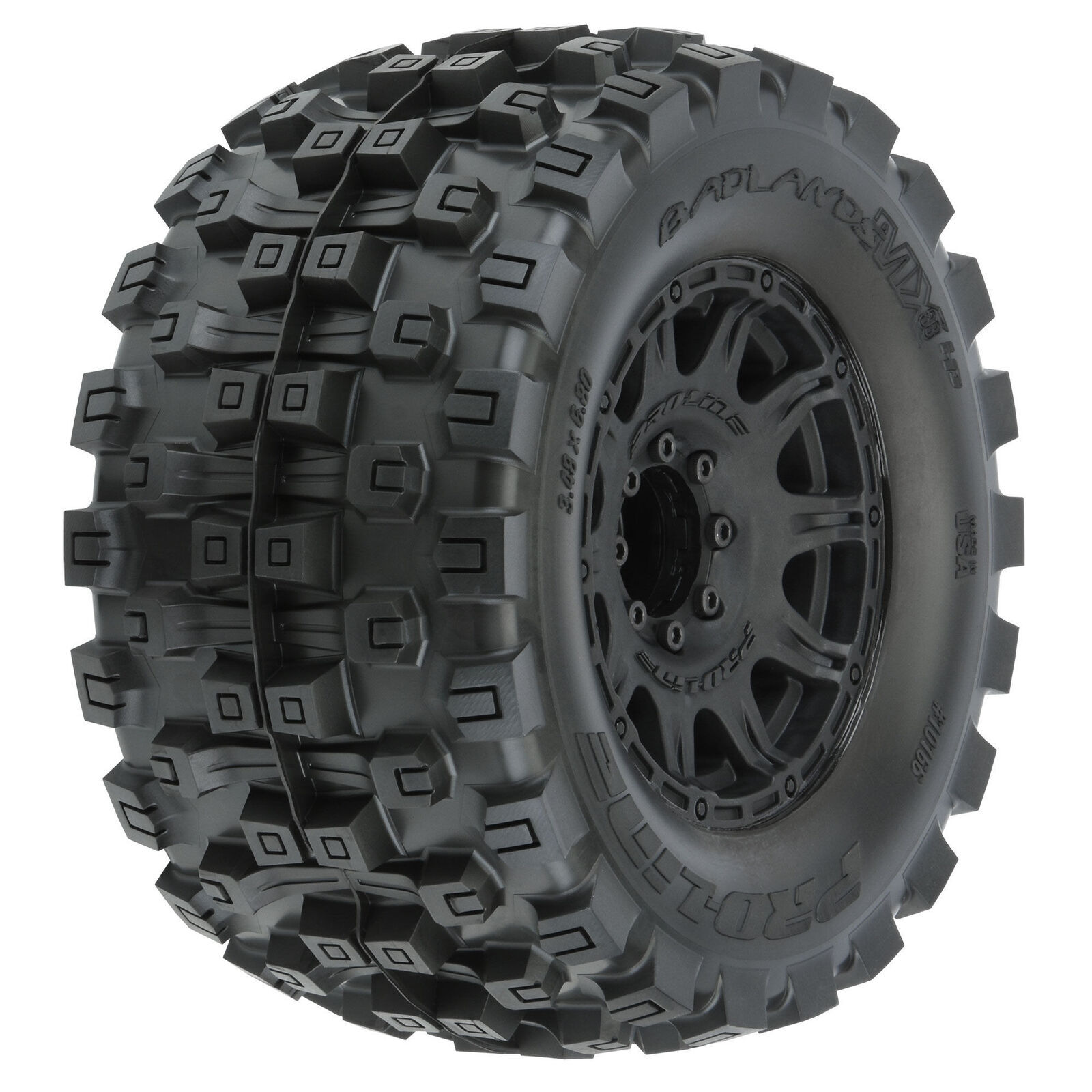 This is a pair of pre-mounted Badlands MX38 HP 3.8" Belted Monster Truck Tires. Pro-Line is taking the 3.8" tire game to the next level with the Baddest tire ever conceived: the Badlands MX38 HP BELTED tires! Pro-Line Badlands tires are known for having a sweet Motocross inspired tread and the all-new Badlands MX38 HP tires kick that up a notch with Bigger and Bolder knobby tread. The Badlands MX38 is a true All-Terrain tire that will find traction on any surface but is best suited for loose AND; loamy dirt, mud or grass. Just imagine your truck throwing up huge rooster tails with these awesome looking tires!