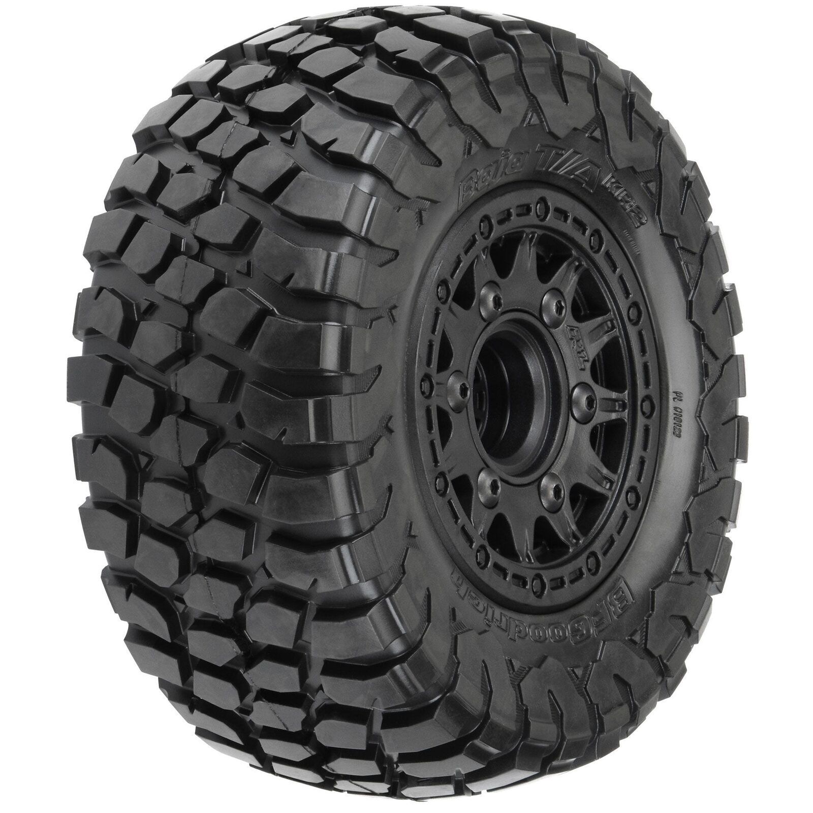 This is a pair of Pre-Mounted BFGoodrich KR2 SC tires on Raid Black 6x30 Removable Hex Wheels. . Pro-Line is proud to announce a partnership with the leading full-size Off-Road tire manufacturer - BFGoodrich ! This collaboration began with the introduction of the race tire that has dominated the 2014 AND; 2015 King of the Hammers race and also crushed the 2015 Baja 1000 taking the top 11 spots - the BFGoodrich Baja T/A KR2 for Short Course Trucks in Pro-Line's legendary M2 compound and Pre-Mounted to Raid Removable Hex Black Wheels! Details from the full-size race winning tire have been recreated to give your truck the ultimate in scale look and desert racing performance. Known for extreme traction and durability in the full-scale world on Trophy Trucks and Ultra 4 vehicles, the BFGoodrich Baja T/A KR2 tire features an iconic layout of large tread blocks with swooping cuts and uniquely designed sidewall tread that will give your rig improved desert racing performance! If you crave scale looks and performance, the all-new BFGoodrich Baja T/A KR2 SC tires from Pro-Line are a must-have.