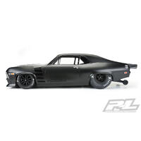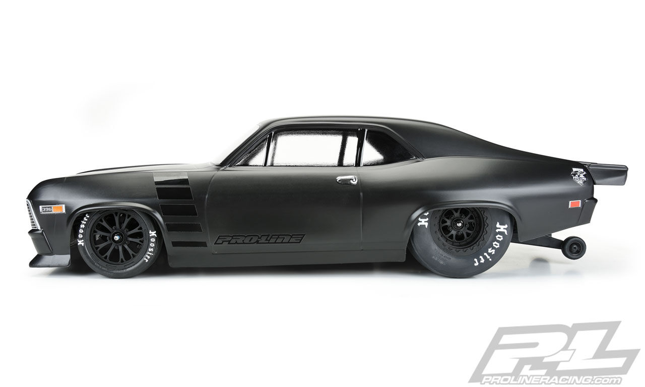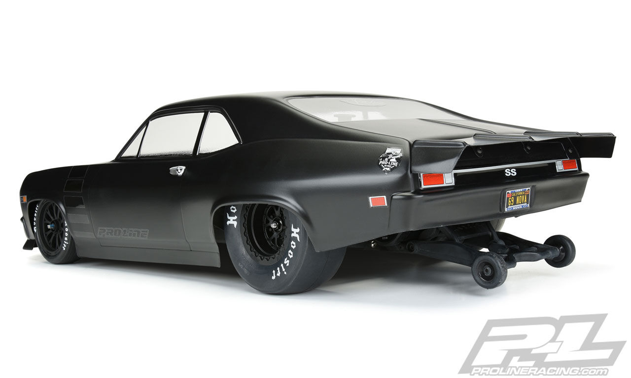 This is a 1969 Chevrolet Nova ¢ ¢ Drag Car Clear body. Pro-Line is proud to introduce the iconic 1969 Chevrolet Nova ¢ ¢ body specifically designed for the growing SC Drag Racing scene! This body is perfect for No-Prep Drag Racing and features an ultra-realistic one-piece body design and includes an optional add on spoiler to complete the drag racing look. No more messing with separate nose pieces to achieve scale front end detail!